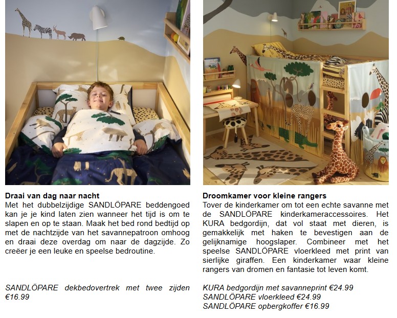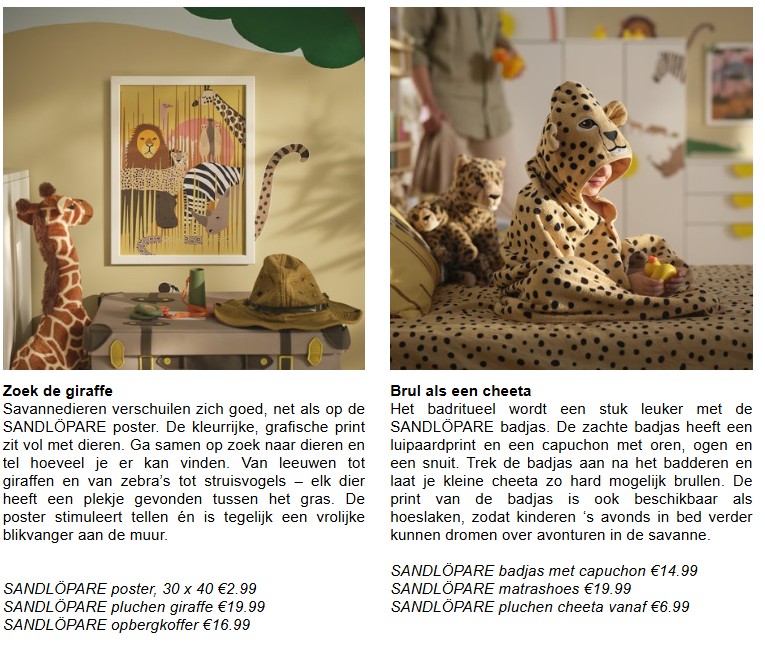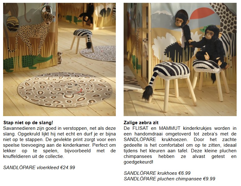 IKEA liet zich voor de avontuurlijke SANDLÖPARE kindercollectie inspireren door uitgestrekte savannes vol bijzondere dieren. De collectie is ontwikkeld in samenwerking met het Zweedse natuurbeschermingscentrum Nordens Ark, met als doel om gezinnen spelenderwijs meer te leren over bedreigde diersoorten. SANDLÖPARE bevat pluchen knuffeldieren die leven op het droge, Afrikaanse grasland: waaronder het sociale stokstaartje, de snelle cheeta en de sierlijke giraffe. De verbeelding wordt geprikkeld met grafische kinderkameraccessoires, zoals een bedgordijn en dekbedovertrekken met savanneprint. Ook zijn er vloerkleden met giraffes en een slang, net als posters waarop dieren zich verstoppen. De SANDLÖPARE kindercollectie is vanaf oktober verkrijgbaar in alle winkels en online.