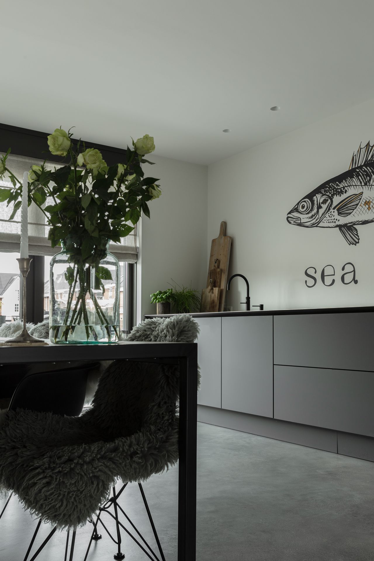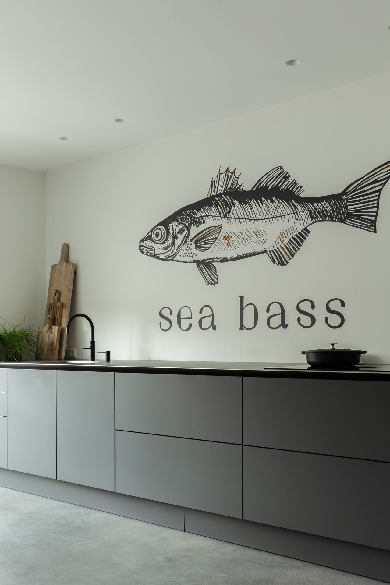 Gevlinderde betonvloer in de kleur 75% midden- en 25% donkergrijs en beton ciré wanden in de kleur NCS 7000 en NCS 3020 in Bunschoten-Spakenburg