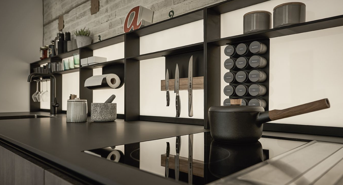 In iedere keuken zijn er spullen die je vaak nodig hebt, maar die niet praktisch zijn om achter kastdeuren op te bergen: kruiden, kookgerei of decoratieve items. Dit nissysteem biedt daarvoor de ideale oplossing. Met een open wandopstelling, opgebouwd uit een strak frame van onyxzwart aluminium, creëer je flexibele opbergruimte die zowel functioneel als esthetisch is. Het systeem maakt optimaal gebruik van nisruimte en is volledig naar eigen wens in te richten. Dankzij de doordachte indeling en geïntegreerde verlichting is alles snel binnen handbereik én mooi gepresenteerd. Zo wordt de muur een waardevolle plek in de keuken, waar design en dagelijks gemak samenkomen.