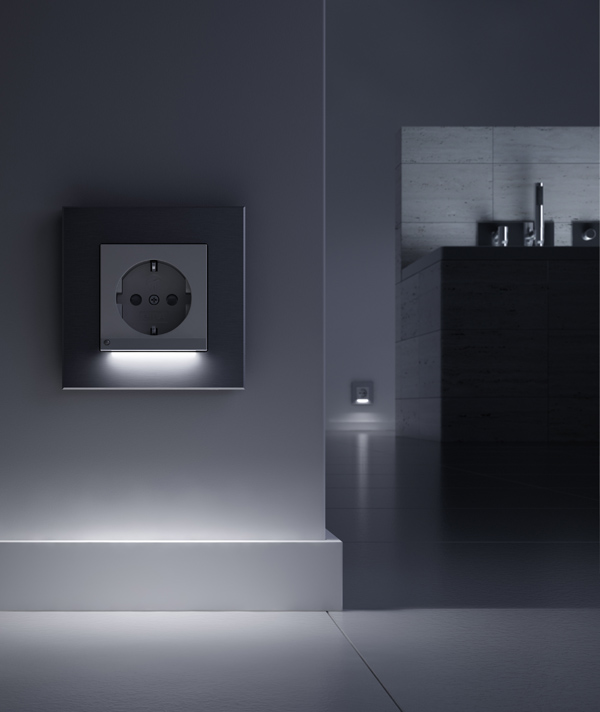 Wandcontactdoos met oriëntatieverlichting assisteert in het donker