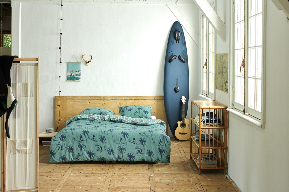 Life is like a beach? Wel als het aan de stoere surfdudes en -girls ligt, die zich golf na golf laten meevoeren, zoals op dekbedovertrek Miko te zien is. Na al die noeste arbeid wordt het natuurlijk maximaal chillen onder een palmboom, dat snappen wij best. Dekbedovertrek Palmere vangt precies dat gevoel van de zon op je oogleden en – als je even tussen je wimpers door spiekt – de palmbomen boven je hoofd. Yes, stop die schoolboeken maar weg, het is vakantie- ehhh… surftijd!