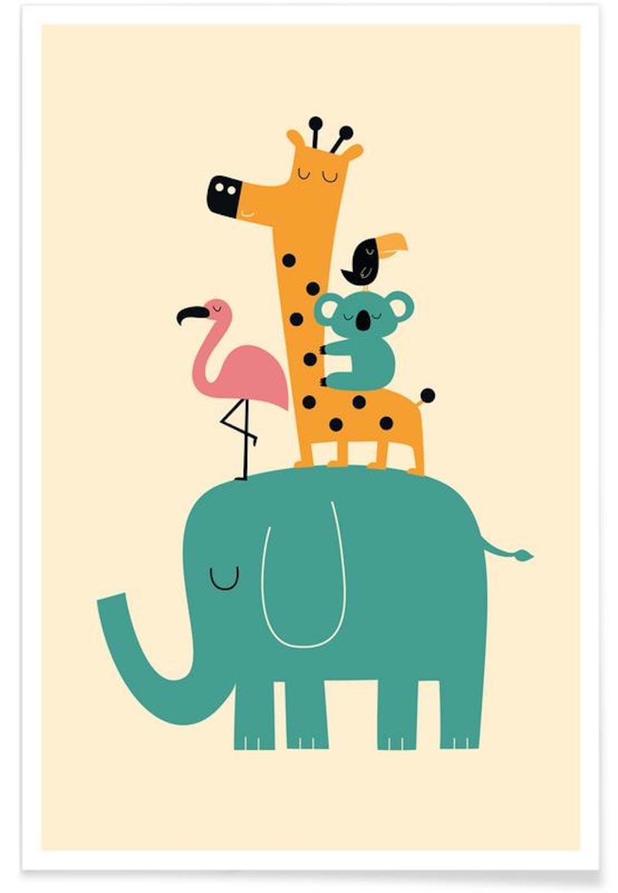 Een giraffe, een olifant, een flamingo, een vogel en een koalabeer, of wel: een hele stapel met vrolijke dieren. Deze kleurrijke illustratie van Andy Westface vond ik als poster bij Juniqe. Hier wordt toch elk kleintje vrolijk van?!