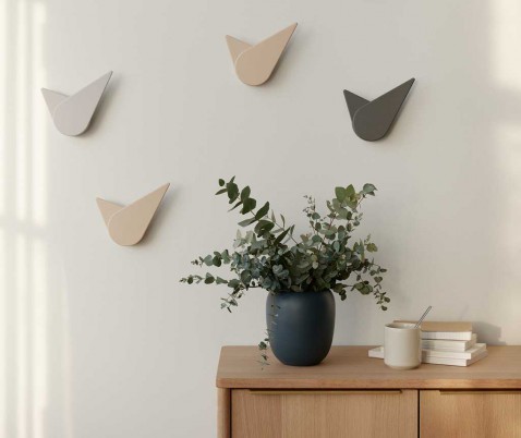 drie basiskleuren: mintgroen, zachtroze en donkerblauw. Ook een naturel houten uitvoering is