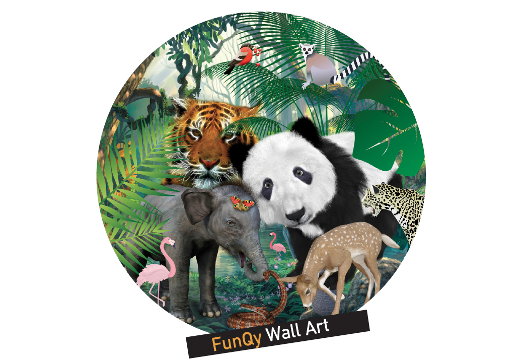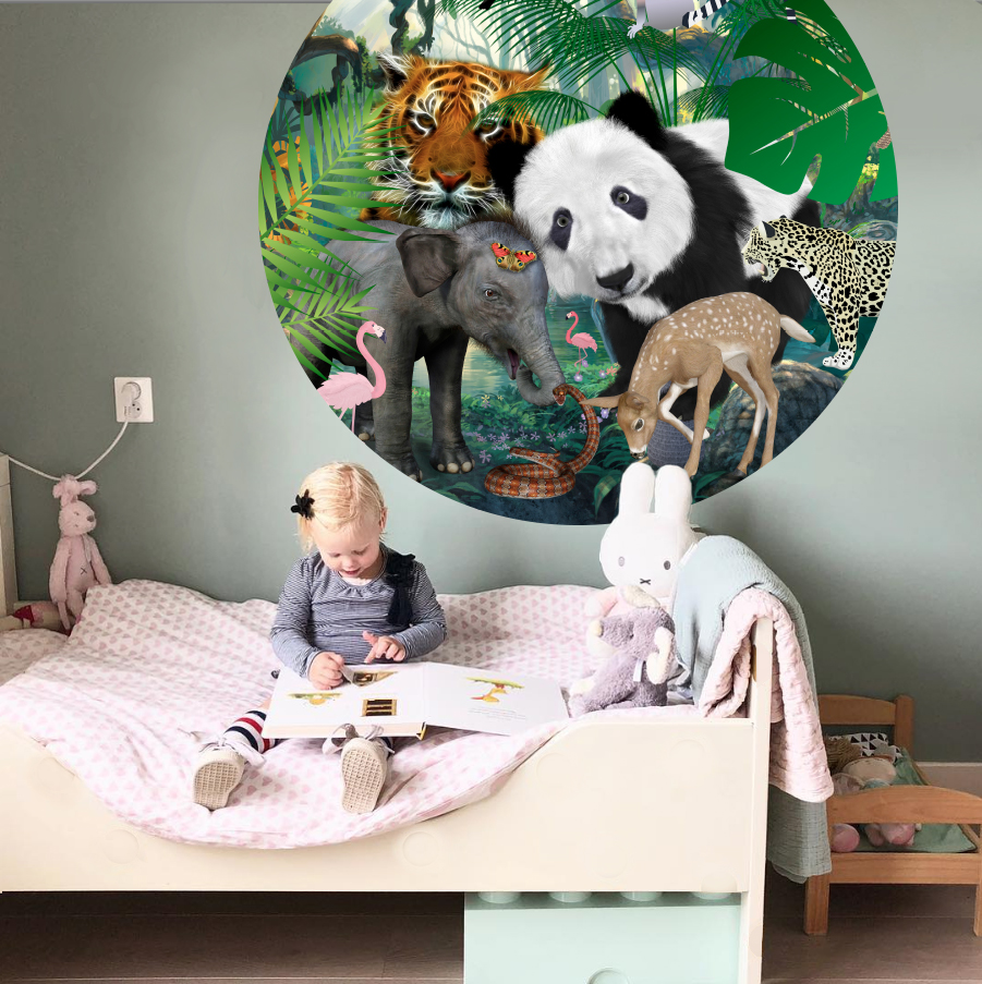 Funqy Wall Art heeft diverse leuke wandcirkels voor op de kinderkamer, bijvoorbeeld deze leukerd; Vriendelijke Jungledieren. De cirkel kan worden uitgevoerd op behang of één van onze 3 plaatmaterialen zoals Forex (verplaatsbaar) op diverse formaten.