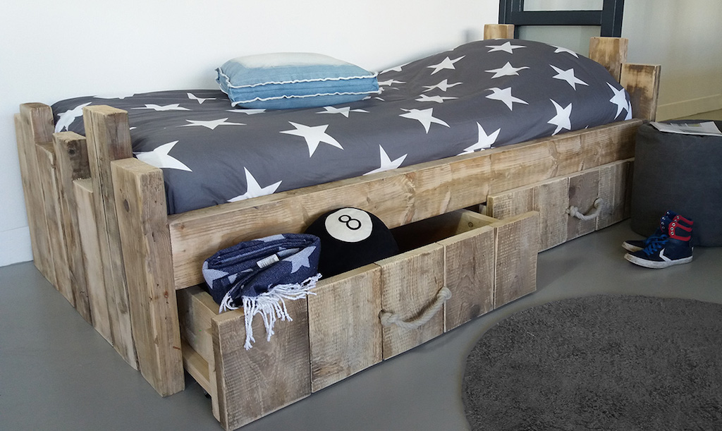 Dit kinderbed van steigerhout is niet alleen heel stoer, maar ook hartstikke handig omdat je er al je speelgoed in kwijt kunt.