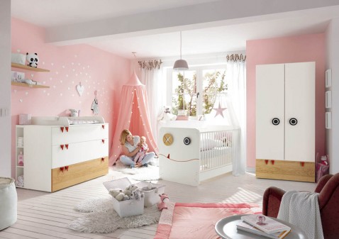 Zowel bij de commodes als de kasten kun je kiezen tussen volledig witte exemplaren of voor een roze of blauw accent. De grappige ronde grepen kun je later vervangen door neutralere exemplaren.