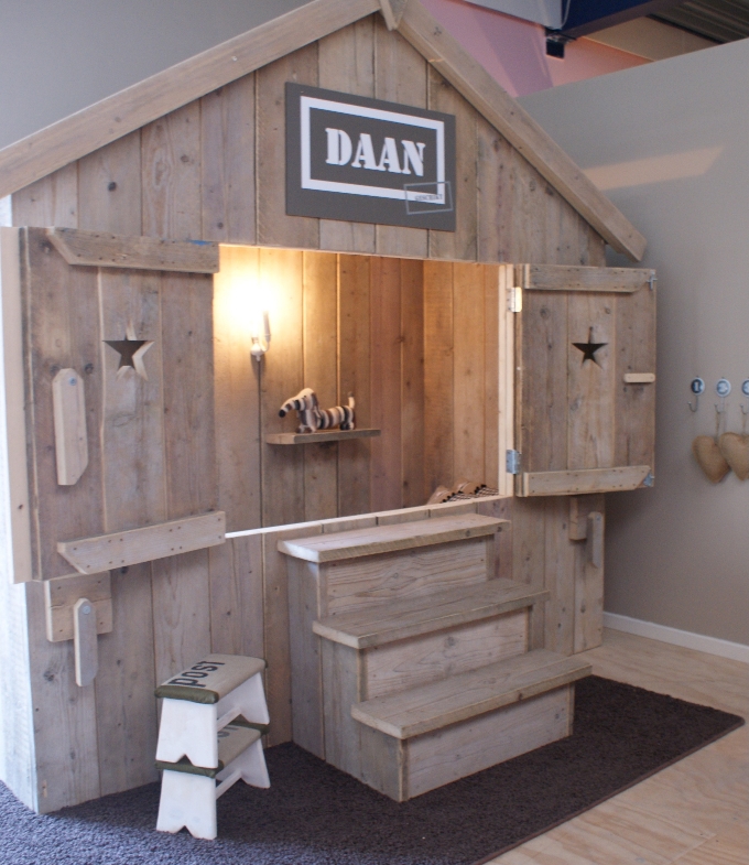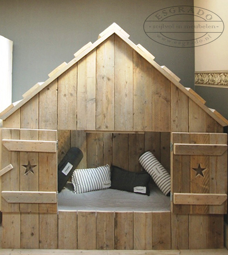 Een droom voor de kinderen, een eigen huisje om in te slapen!! U kunt het bed naar wens laten maken en u eigen creativiteit in de praktijk brengen.Op de website kunt u verschillende voorbeelden van de bedsteden vinden. http://www.esgrado.nl/steigerhouten-meubelen/steigerhouten-kinderkamer/steigerhout-kinderbedden.html