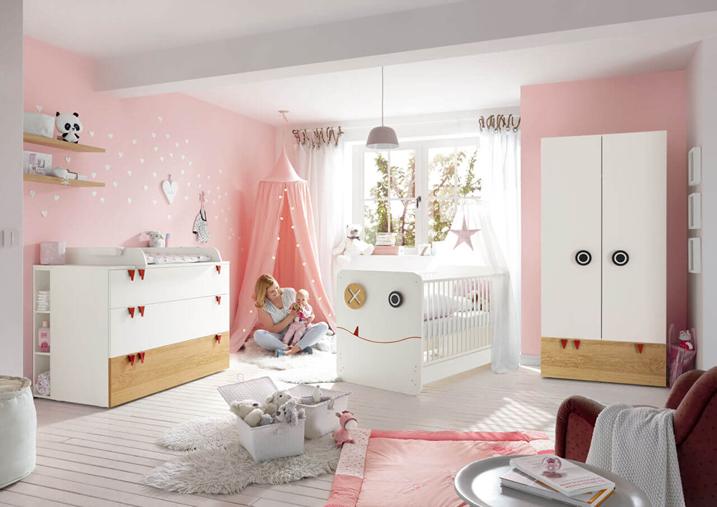Het hele programma van commodes en kasten is behalve in volledig wit, wit-roze en wit-lichtblauw in een nieuwe uitvoering verkrijgbaar: natuurlijk eikenhout zet accenten bij de fronten van kasten en commodes en maakt de collectie zo ook aantrekkelijk voor oudere kinderen. De grappige ronde grepen kun je later vervangen door neutralere exemplaren.
