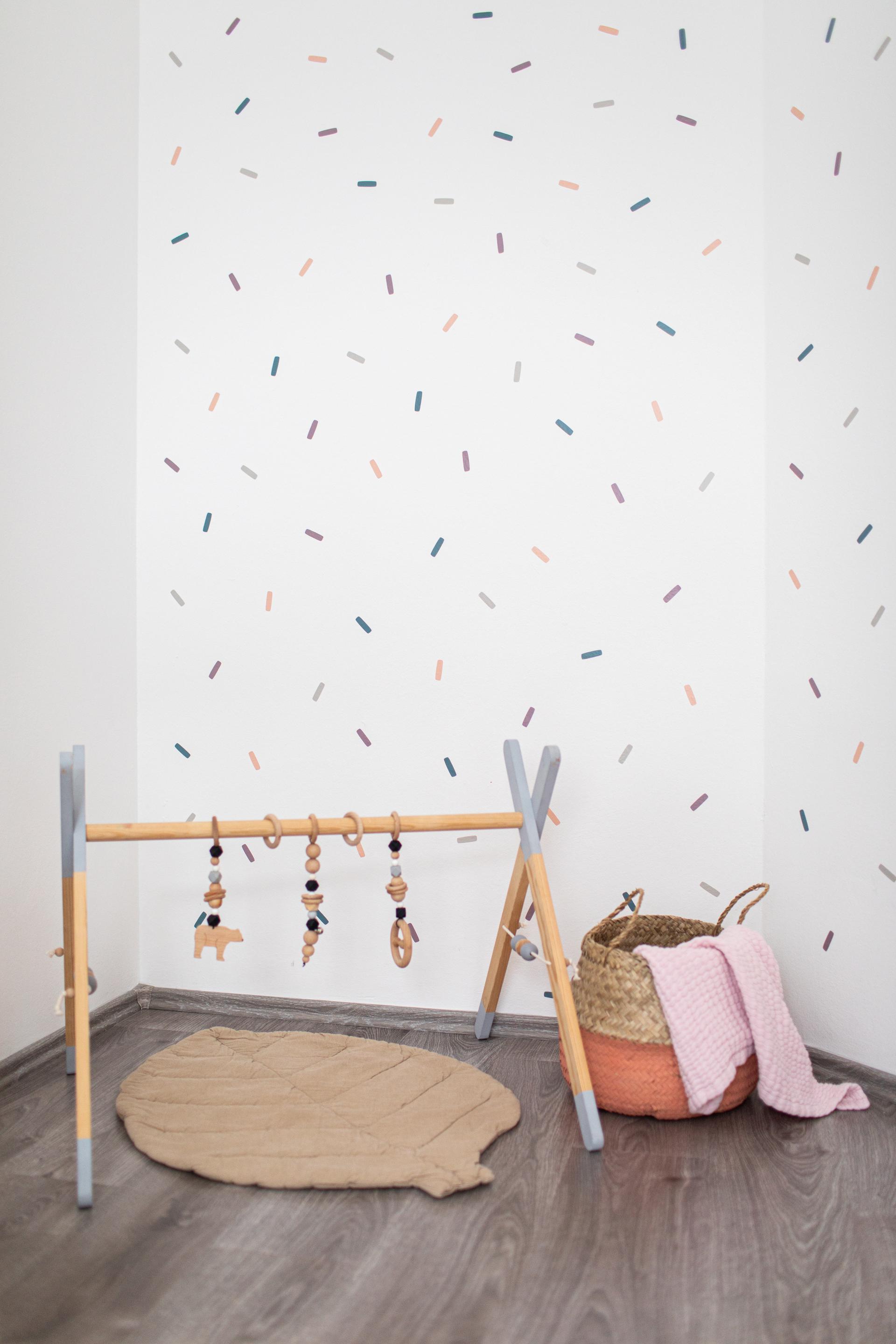Eenvoudiger kan niet: de Cricut-snijmachine snijdt kleurrijke confettisnippers uit vinyl en rangschikt daarbij alle afzonderlijke onderdelen om zoveel mogelijk materiaal te sparen. Na het verwijderen van de randjes, een heel leuk werkje trouwens, heb je zelfklevende stickers die je naar wens op de muren kunt aanbrengen. In één oogwenk verandert een eenvoudige kamer zo in een levendige kinderwereld.