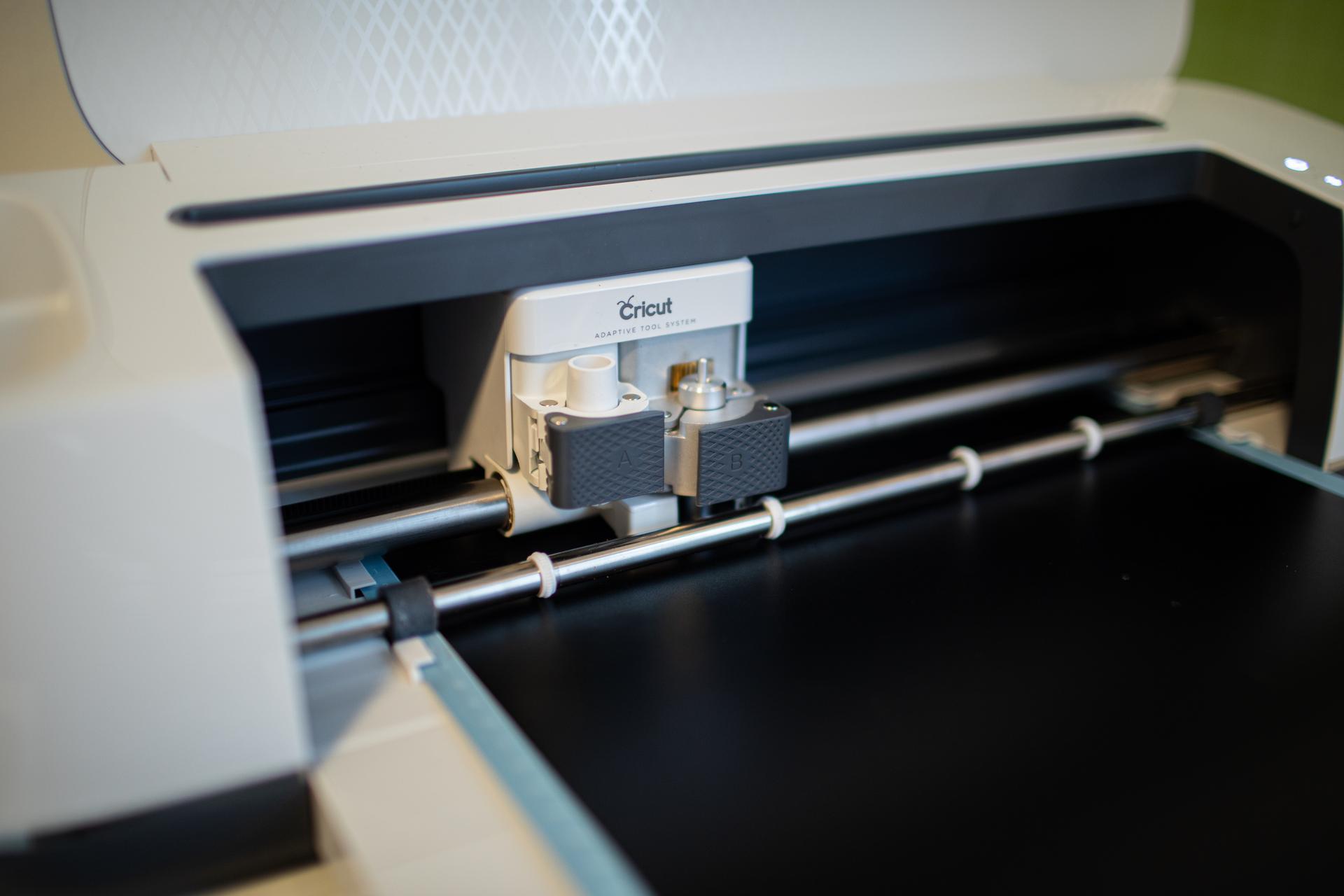 De zwarte vinylfolie wordt vanaf de snijmat in de Cricut Maker getrokken. Met een druk op de knop begin je het snijproces.