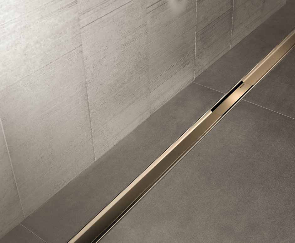 Eyecatcher in je inloopdouche: de nieuwe zwartchromen en champagnekleurige douchevloergoot.