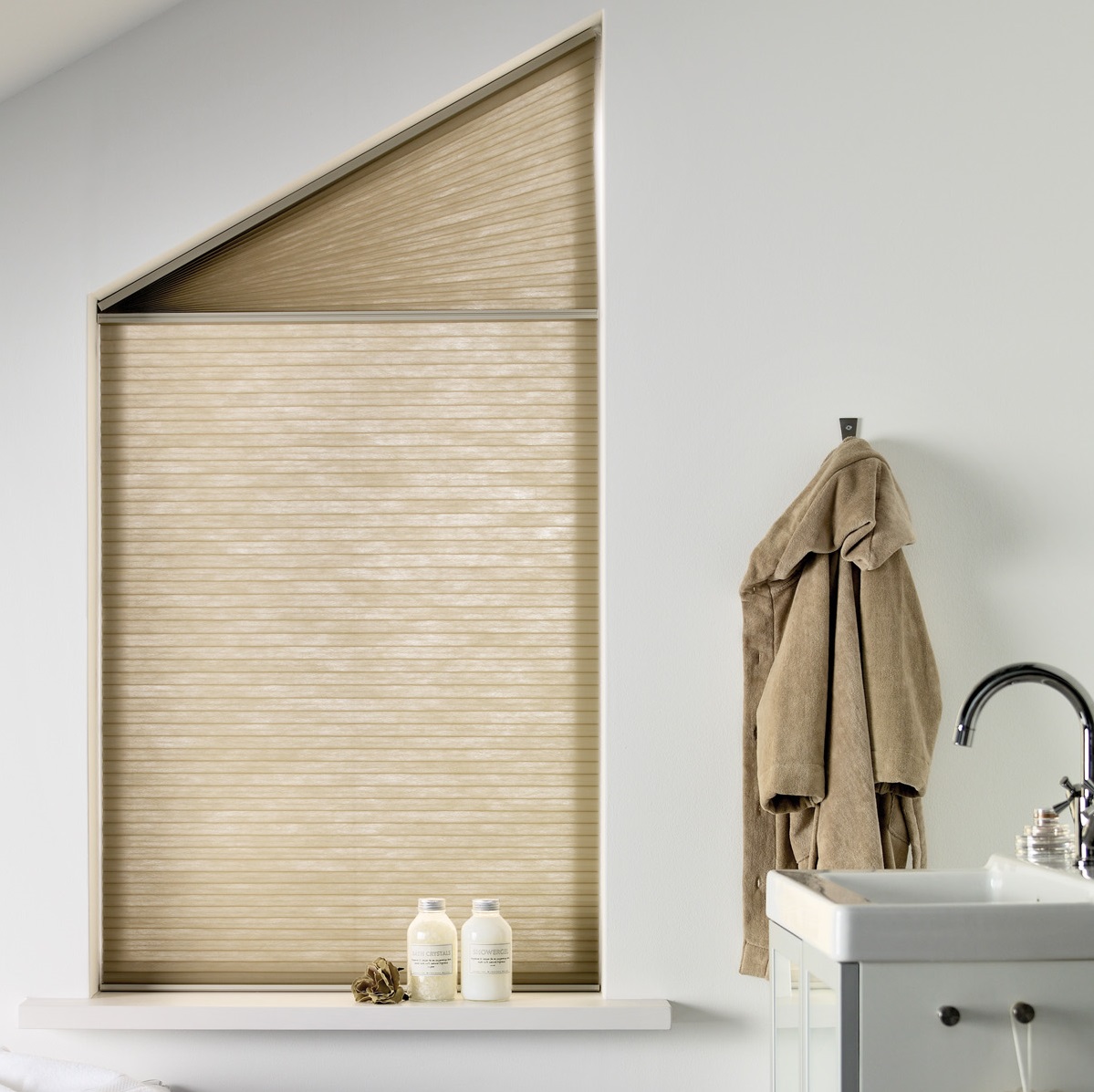 De meeste stoffen van plissé en Duette® zijn bestand tegen vocht- en condensvorming. Dit betekent dat ze prima geplaatst kunnen worden in een badkamer die goed wordt geventileerd en waar de raamdecoratie niet direct nat wordt.