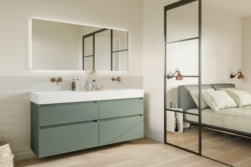 Gecompleteerd met een dun Solid Surface blad, opbouwkommen of het strakke keramische wastafelblad geeft het gehele plaatje een volwassen uitstraling.