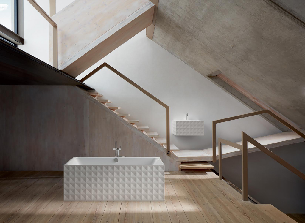 De Duitse sanitair fabrikant Bette verrast opnieuw met de spectaculaire vorm van een geometrisch patroon in haar nieuwe serie ligbaden en wastafels Bette Loft Ornament. Een patroon dat is gestanst in de mantel. Dit is zeer uniek en een duidelijk bewijs van de expertise en bijzondere mogelijkheden die Bette biedt op het gebied van architectonische sanitair objecten. Die zijn vervaardigd van het robuuste en duurzame materiaal geëmailleerd titaanstaal. Het design, een ontwerp van Tesseraux + Partner, geeft het ligbad en de wastafel een zeer opvallend en kunstzinnig beeld. De strakke lijnen sluiten naadloos aan bij de vier taps toelopende vlakken van de binnenzijde. Daarbij zorgen de geometrische vormen van de buitenzijde voor een verrassend spel van licht en schaduw. Een schitterend effect dat deze badkamerobjecten een bijzondere uitstraling geeft.
