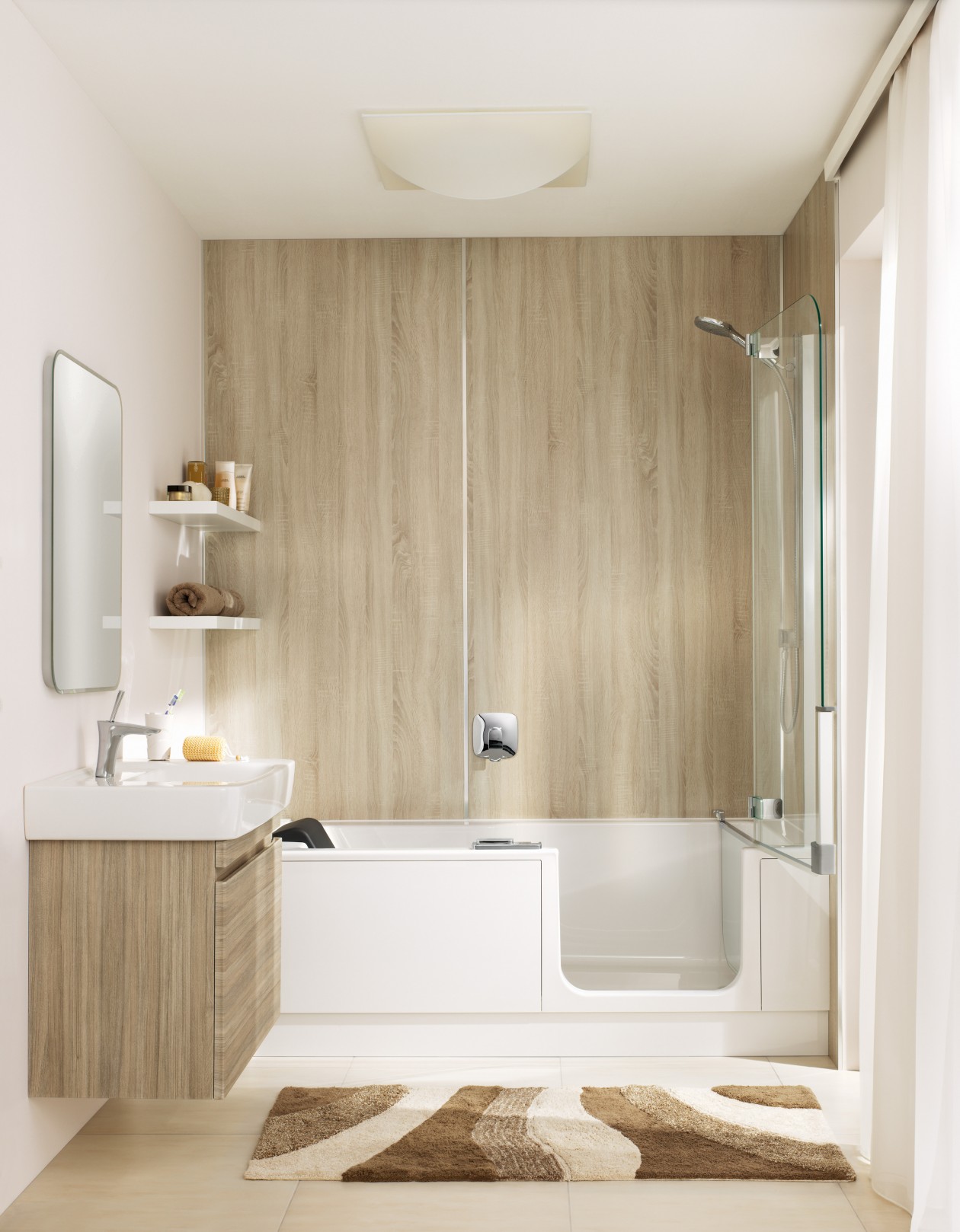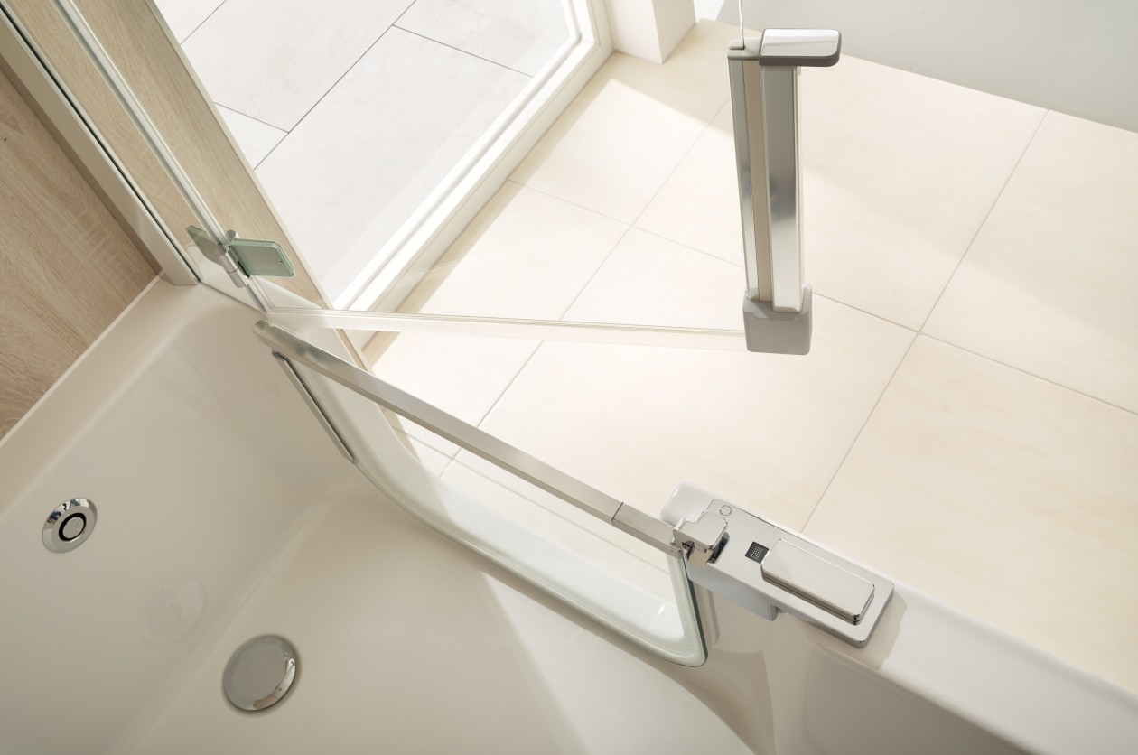 Het instapbad Twinline 2 is verkrijgbaar met een doorlopende douchedeur, lage baddeur of een gedeelde baddeur.