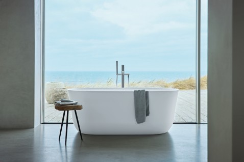 De vorm van de vierkante versie van het vrijstaande DuraSolid® ligbad met een afmeting van 1250 x 1250 mm is afgeleid van de vierkante opzetwastafel. Met de juiste diepte nodigt het uit om je onder te dompelen in het water en doet het denken aan een Japans Onsen-bad (Een Japanse badgelegenheid met water uit een geiser). Het bad is ook verkrijgbaar in twee compacte uitvoeringen van 1600 x 850 mm en 1800 x 900 mm, optioneel met het geïntegreerde luchtwhirlsysteem met een zacht massage-effect.