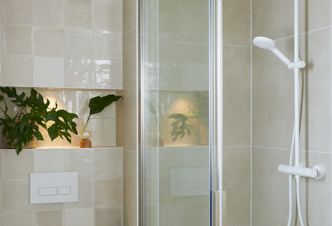 Een zachte kleur geeft de badkamer kalmte, terwijl speels gebruik van verschillende tinten een gevoel van ongedwongenheid creëert. Zo ontstaat de perfecte combinatie van rust en vrijmoedigheid. Pastelkleuren, zoals deze zachtgrijze variant, zijn bij uitstek een goede keuze om deze stijl in de badkamer vorm te geven.