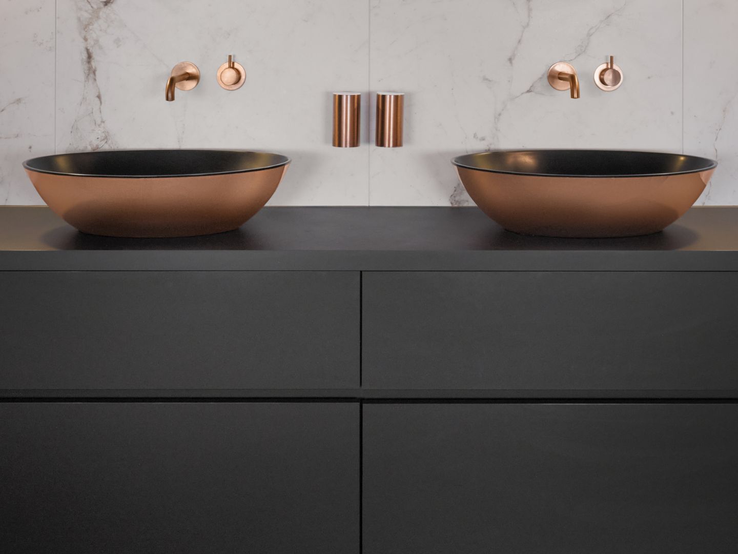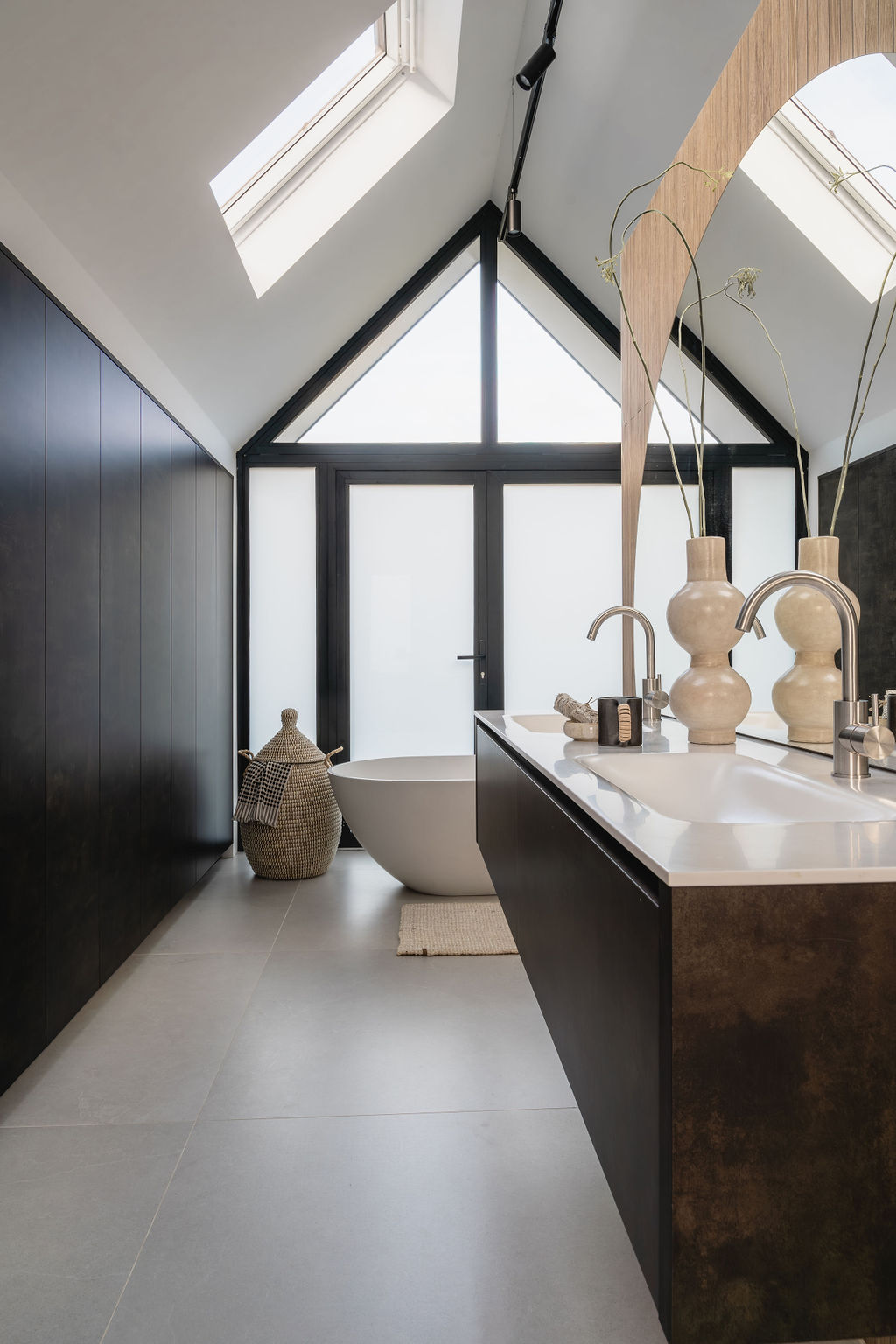 Het Solid surface vrijstaande bad in combinatie met de waskommen dient als eye catcher in de badkamer. Het bad en de waskommen hebben we speciaal voor de klant laten afwerken in een bronzen kleur. Dit geeft een unieke uitstraling en past bij de algehele stijl en wens van de klant. De mat zwarte Fenix afwerking van het meubel dient als contrast om de bronzen elementen nog meer naar voren te laten komen. Voor de tegels is gekozen voor de matte uitvoering op de wanden en vloer.