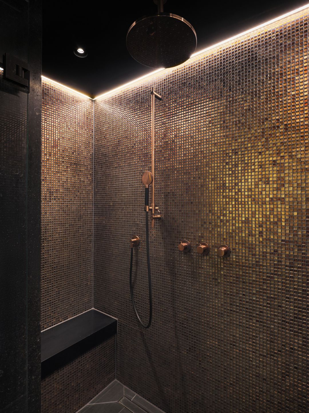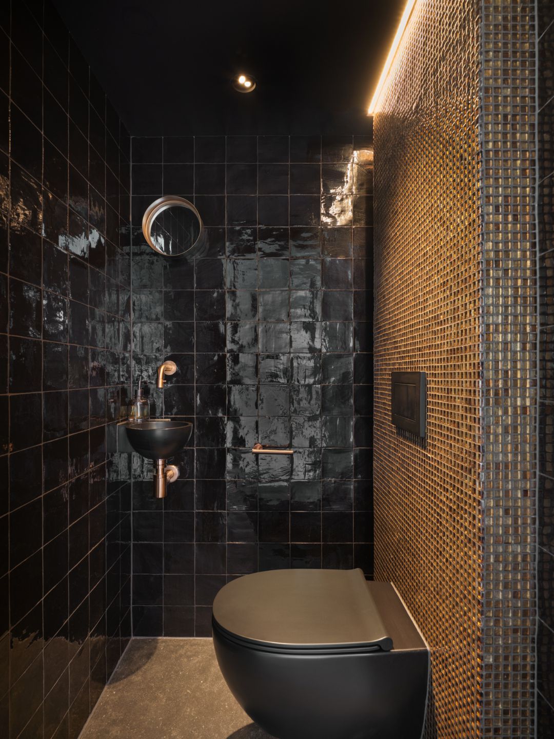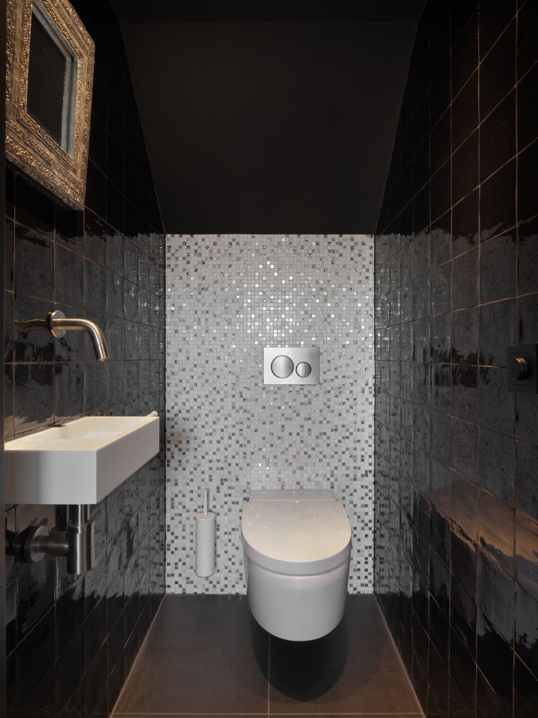 Voor de toiletruimtes is per verdieping gekozen voor een stijl dat aansloot bij de verdieping en huidige stijl van de naastgelegen ruimtes. Het goed afgestemde lichtplan maakt dat de badkamer en toiletruimtes nog meer sfeer heeft gekregen. Zo komt het glas mozaïek extra mooi naar voren door de led verlichting aan de bovenzijde. Het bad wordt extra uitgelicht door de ledstrip onderaan het plateau.