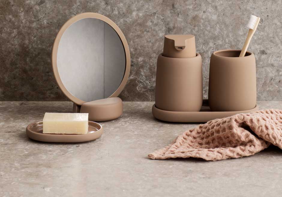 De collectie bestaat uit een beker, vrijstaande cosmeticaspiegel, afvalemmer, zeepschaaltje, zeepdispenser, wc-borstelhouder en nog een handig schaaltje waarop je allerlei dingen kunnen leggen. In het blomus assortiment bevinden zich ook bijpassende handdoeken en washandjes voor de perfect afgestemde look.