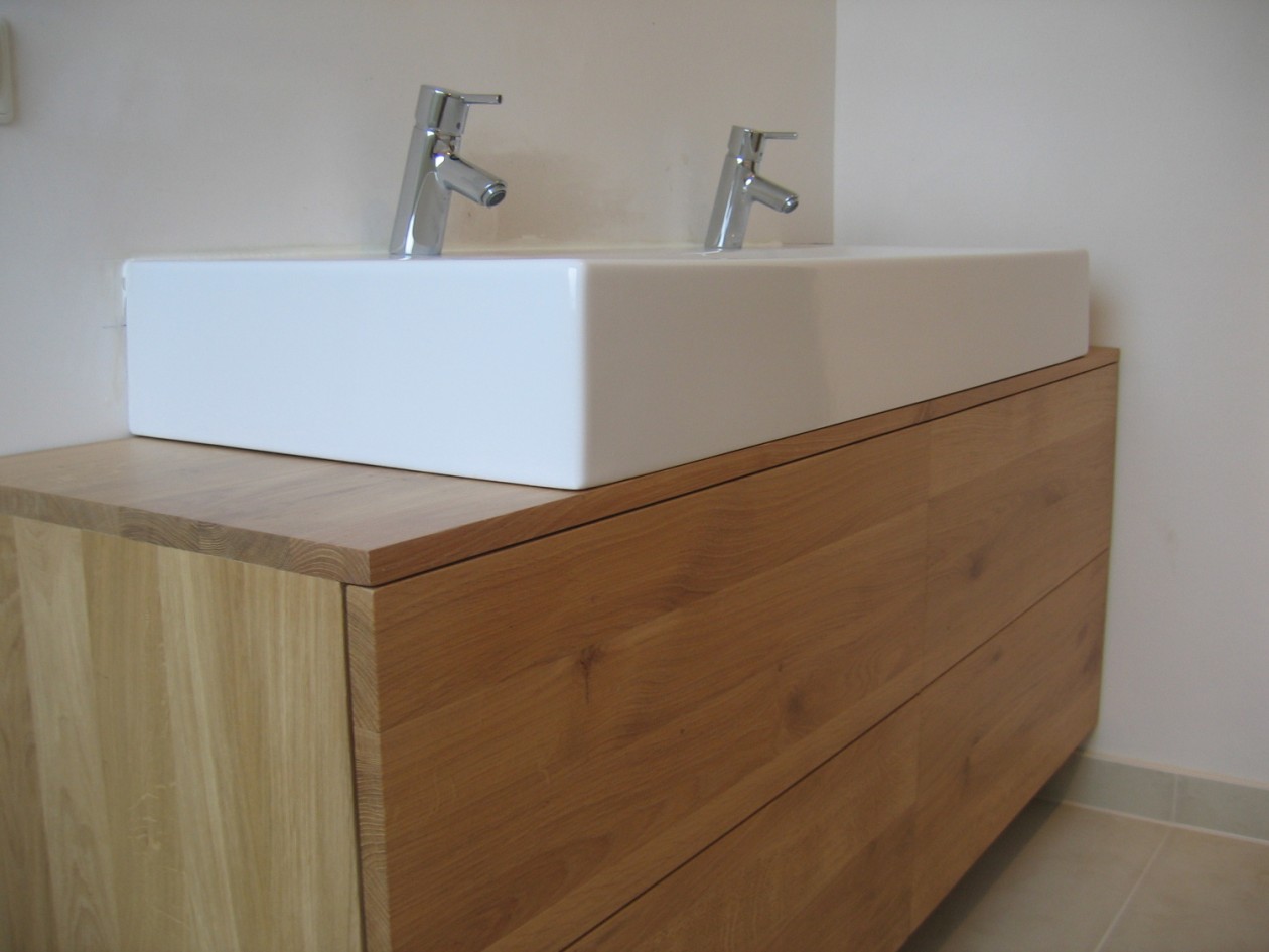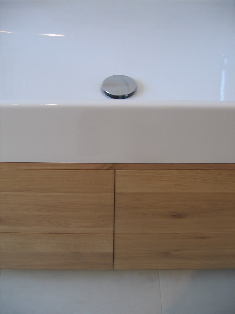 Badkamermeubels van massief europees eikenhout, heel licht opaal ingekleurd, transparant zijdeglans afgewerkt. Het wastafelmeubel bevat twee keer drie lades, greeploos (push-systeem). De bovenste lades bevatten uitsparingen voor het diverse leidingwerk. Als opbouw een grote dubbele, witte keramische wasbak. Het meubel is zwevend opgehangen.