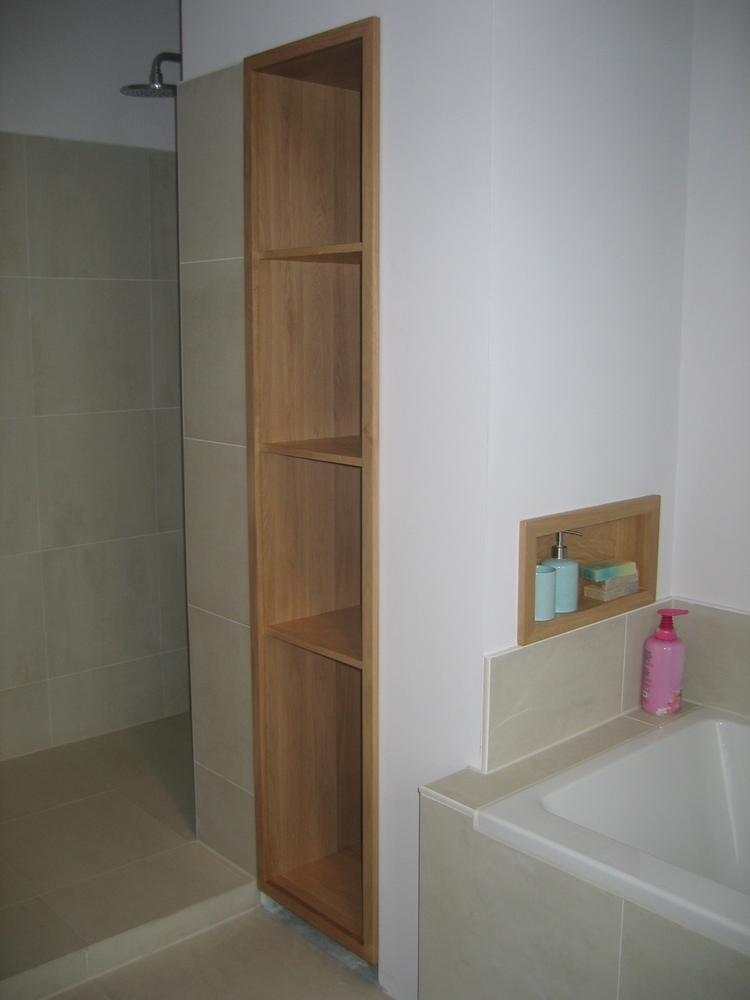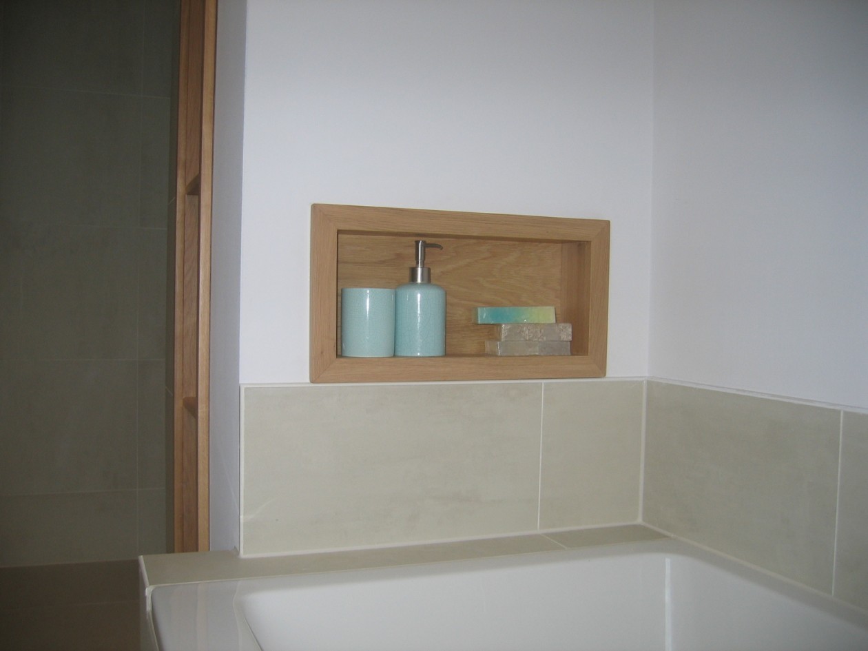 Aan de ligbadzijde is van hetzelfde eikenhout een ingebouwde niskast gerealiseerd (afmetingen ca. 46x205x46 cm, bxhxd) voor handdoeken etc. Aan de smalle zijde van het ligbad is een kleine nis van eikenhout ingebouwd.