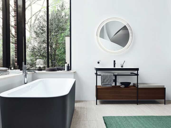 Duravit integreerde een gemakkelijk zitje in haar badkamermeubel uit de Happy D.2 Plus serie. De metalen console met geïntegreerde handdoekhouder wordt optioneel met afdekplaat of lade geleverd waardoor een handig zitelelement ontstaat.