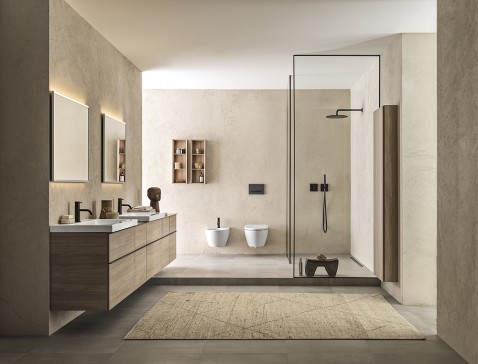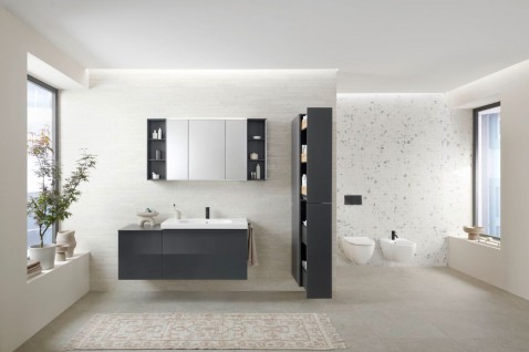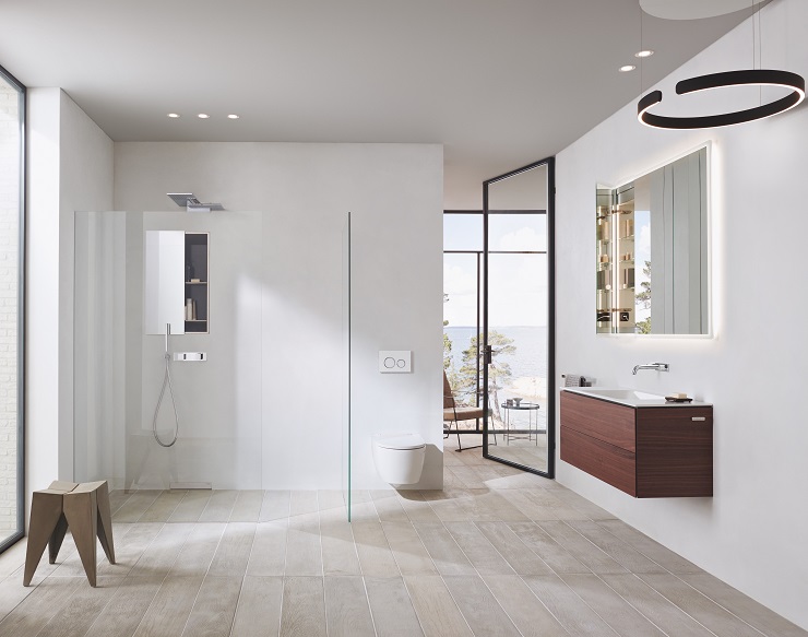 Door verschillende oplossingen niet tegen maar in de muur te plaatsen, wordt er creatief gebruik gemaakt van de ruimte. Functionaliteit en design gaan op een vernieuwde wijze hand-in-hand. Denk aan de spiegelkast, de wastafelsifon, de douchewand en douchenis. Niet alleen het verwerken van producten in de muur zorgt voor een ruimtelijke aanblik, ook het minimalistische, slanke design van de meubels en het keramiek laat de badkamer ruimtelijk voelen. Alle producten zijn voorzien van bijzondere details, die het comfort van de badkamer verhogen en een flexibele inrichting mogelijk maken.