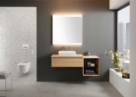 Geberit ONE integreert o.a. de wastafeltechniek, de spiegelkast en de doucheschappen in de wand. Doordat de wastafelafvoer niet naar onder in de sifon loopt, maar naar achter in de wand, verrast de wastafelkast eronder met een indrukwekkende hoeveelheid opslagruimte. De wastafel kent een strak ontwerp door de geïntegreerde overloop. Opvallend is de spiegelkast en de douchenis met schappen. Deze zijn ook in de wand gemonteerd, waardoor er optisch geen kast of plankjes aanwezig zijn. Hier zijn, net als bij de ONE douchewand, alle benodigde aansluitingen in de wand weggewerkt.