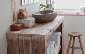 Dit steigerhouten badkamermeubel laat zien dat je zelfs met hout een romantische sfeer kunt creëren in de badkamer. Een bijna standaard steigerhouten meubeltje, met een fraaie kom en kraan (privébezit), en de basis is gelegd voor een unieke badkamer. De Steigeraar maakt een heleboel verschillende badkamermeubels maar uit deze badkamer blijkt maar weer dat zich in de beperking de meester toont.