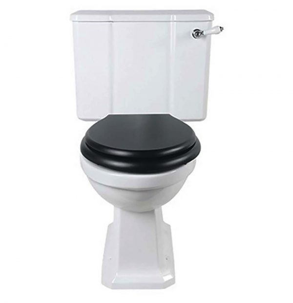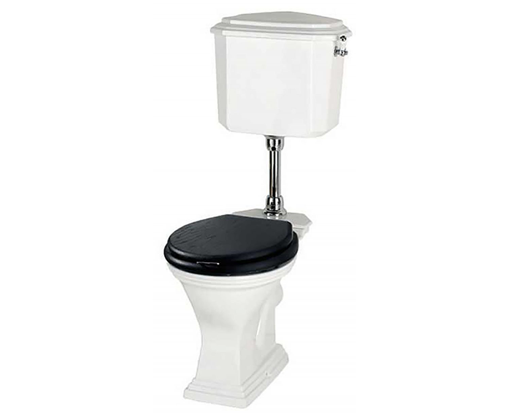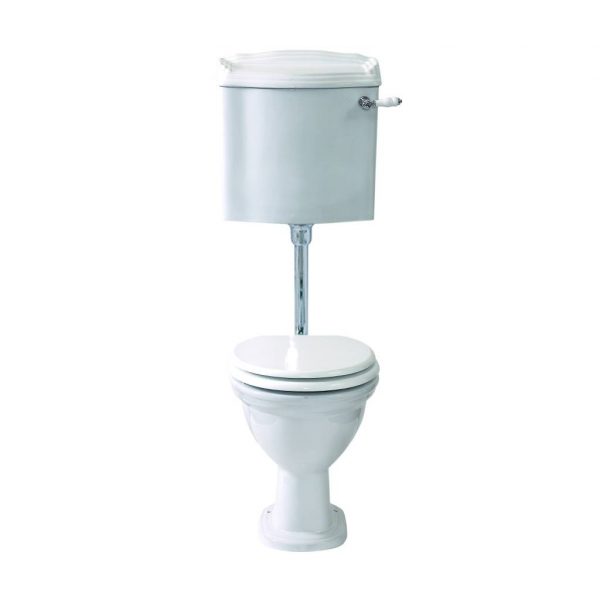 Klassiek toilet in de kleur wit. Dit landelijke toilet wordt geleverd met hoog reservoir met binnenwerk en doorspoelhendel.