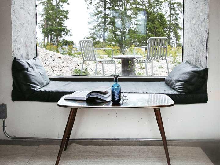 'Savannen 12' is een van de buitengewone objecten van Skälsö Arkitekter op Bungenäs. Het bestaat uit een oude bunker die aan een van de lange zijden werd uitgegraven. Een groot venster in het metersdikke beton zorgt voor licht in de binnenruimte, die als keuken, woon- en eetkamer wordt gebruikt en een spannend uitzicht op het landschap biedt. De diepe kozijnen dienen niet alleen als zitgelegenheid, maar ook als slaapplek voor gasten. Net zoals de zwartgevlekte buitenmuur, werden de zaagsporen van het werk aan het raam niet weggewerkt. Ook originele details en patina bleven behouden.