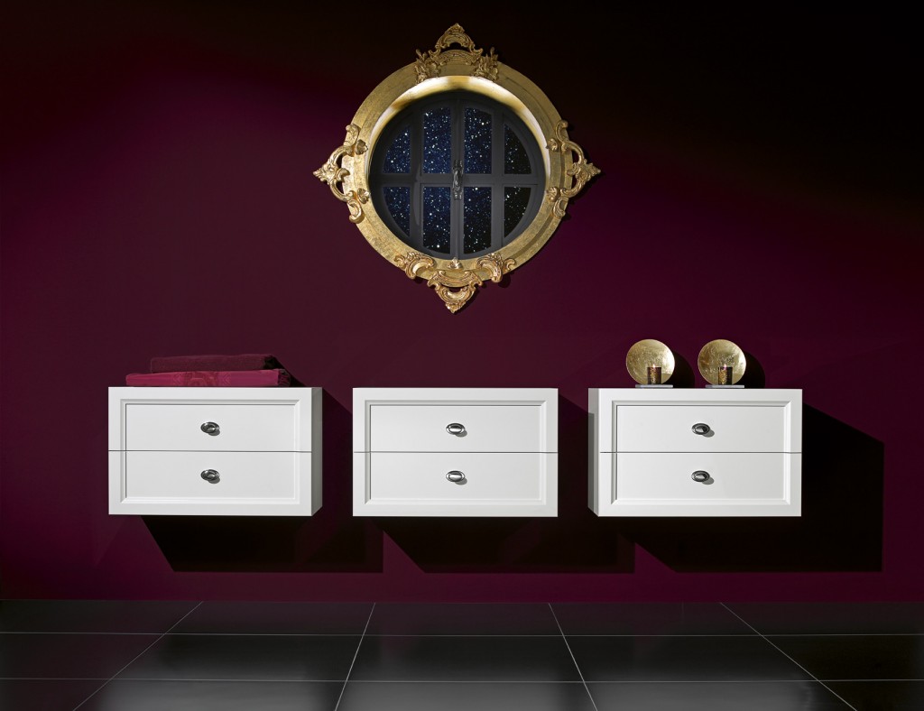 Het premium meubelprogramma is in twee kleuren leverbaar: glanzend wit en glanzend framboos. De warme framboostint voegt een bijzondere kleur toe aan de badkamerinrichting en geeft het design een eigen accent. De elegante wastafel op pootjes benadrukt de vrouwelijkheid van de wasruimte, terwijl het slanke wastafelmodel met lade de moderne kant van de collectie belicht. Naar keuze zijn een bijpassende hoge kast, zijkast, kaptafel met lamp, lade en kruk en drie verschillende spiegels leverbaar. De hoge kast, de kruk en de spiegels zijn leverbaar met het La Rose decor in de vorm van een bloemenrank. Het interieur van de kasten en lades is zeer bijzonder: met fluweel beklede ladebodems en gedecoreerde glazen planken.
