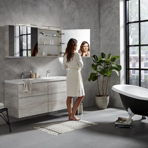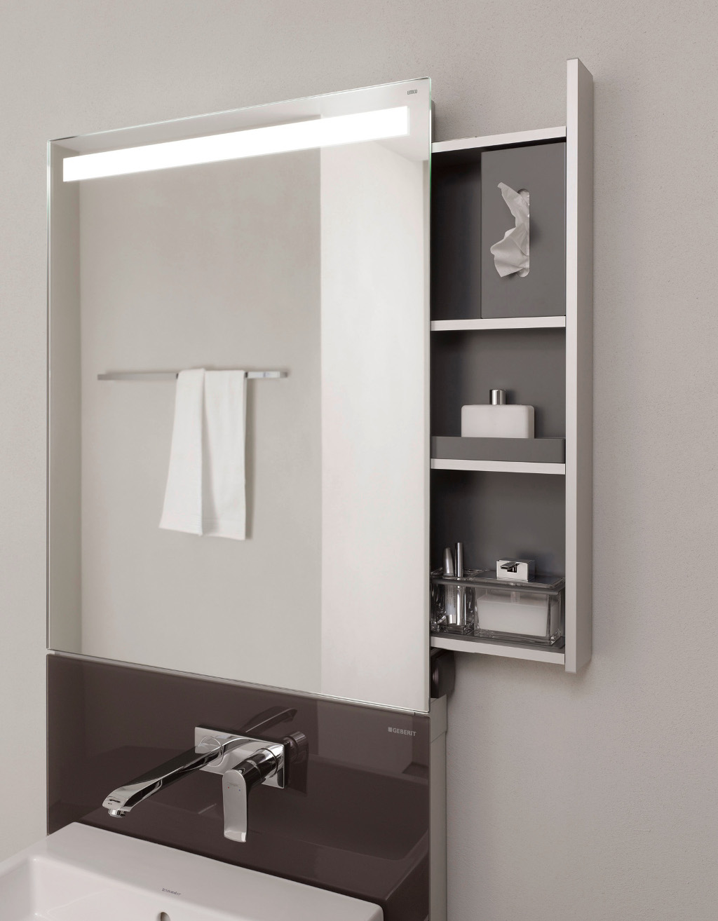 Voor een harmonieuze ambiance alsook voor hoog comfort zorgt een optioneel opbergsysteem dat werd ontwikkeld voor een goed passende integratie in de zijdelingse uitschuifbare laden van de lichtspiegelkast van het programma. Daartoe behoren een tissuebox plus tevens een ronde scheer- en cosmeticaspiegel met een doorsnede van 120 mm en tevens een relingsysteem dat is uitgerust met een mondspoelglas alsook naar keuze met een vloeibare zeepdispenser of een zeephouder uit hoogwaardig kristalglas. Bovendien biedt een verder relinginzetstuk de in de lichtspiegelkast geplaatste benodigdheden een goede plek. Alle accessoires zijn – passend bij de achterwanden van de zijdelingse uitschuifbare laden – gefabriceerd van gelakt metaal (RAL 7011, ijzergrijs) en kunnen met behulp van een magneetverbinding flexibel en tegelijkertijd antislip op de gewenste plek worden geplaatst. Bij een combinatie van de lichtspiegelkast met de wastafelmodule van de fabrikant uit Pfullendorf zorgt een speciaal voor de goed passende, comfortabele montage geconstrueerde adapter er bovendien voor dat beide elementen optisch een naadloos in elkaar overlopende eenheid vormen.