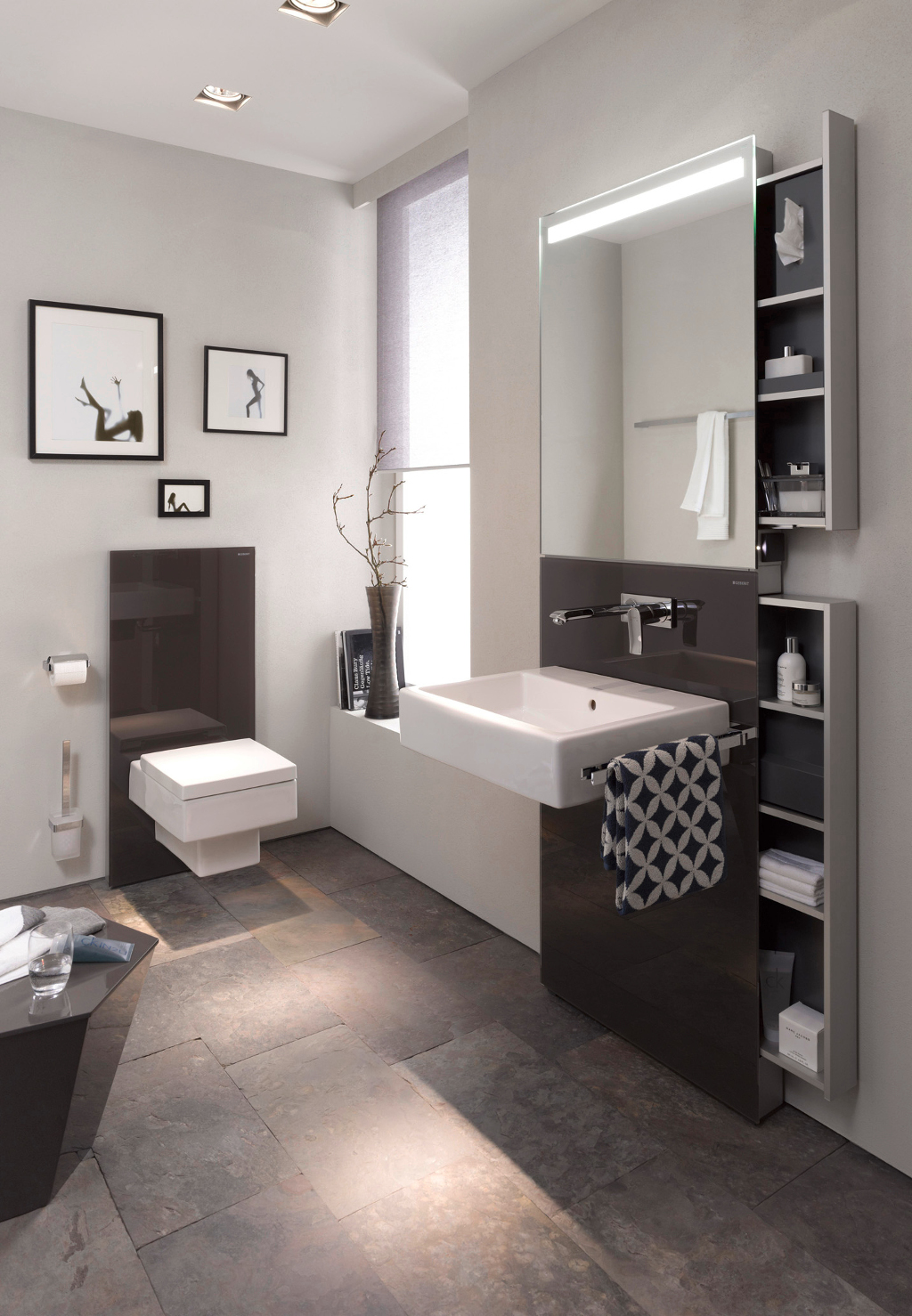 Een stijlvolle en tegelijkertijd praktische aanvulling op het programma vormen de uit een hoogwaardige aluminiumconstructie vervaardigde module-eenheden in verschillende uitvoeringen. Royale bergruimte bieden een 314 mm brede en 1.584 mm hoge kastmodule met een dubbelzijdig doorlopend verspiegeld deuroppervlak alsook twee verdere 314 mm brede en met glasoppervlakken uitgeruste kastmodules – 1.564 mm en 964 mm hoog. Intelligent ingedeelde opbergmogelijkheden van aluminium en/of glas alsook een energie-efficiënte LED-lichtlijst boven in de 1.564 mm hoge module zorgen voor orde en overzicht. Verder wordt een, dankzij een breedte van slechts 168 mm en een hoogte van 787 mm zeer slank ogende wc-module aangeboden die is uitgerust met een toiletrolhouder, een vak voor een reserverol of een box vochtig toiletpapier alsook met een borstelgarnituur. De hoogwaardige glasfronten kunnen daarbij eenvoudig en comfortabel worden geopend door middel van een lichte vingerdruk. Er is keuze uit de glaskleuren wit, zwart of umbra, welke exact zijn afgestemd op de oppervlaktekleuren van de sanitairmodules uit de Monolith-serie van de fabrikant Geberit.