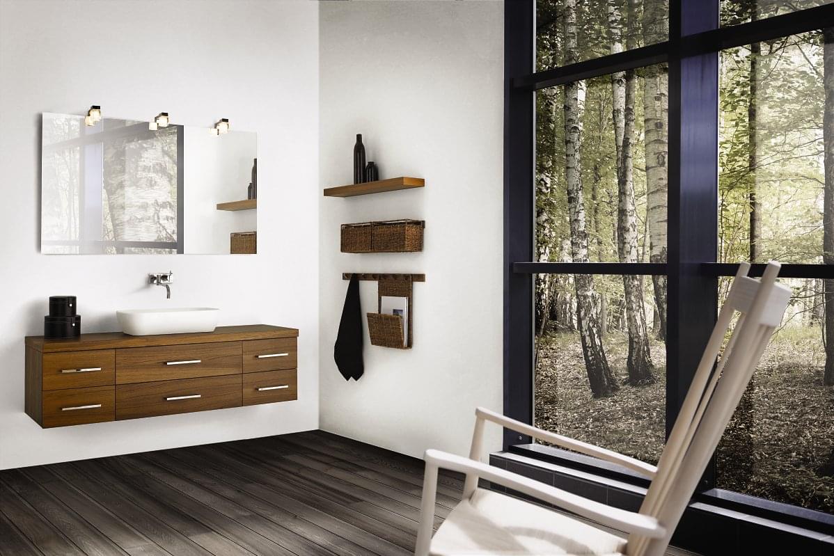 De warme gloed van de houtsoort Nougat geeft de badkamer karakter en een sfeer die uitnodigt tot ontspannen en genieten. De combinatie met de wastafel Menuet, gemaakt uit klassiek wit keramiek, zorgt voor een spannend contrast en voldoende aflegruimte.
