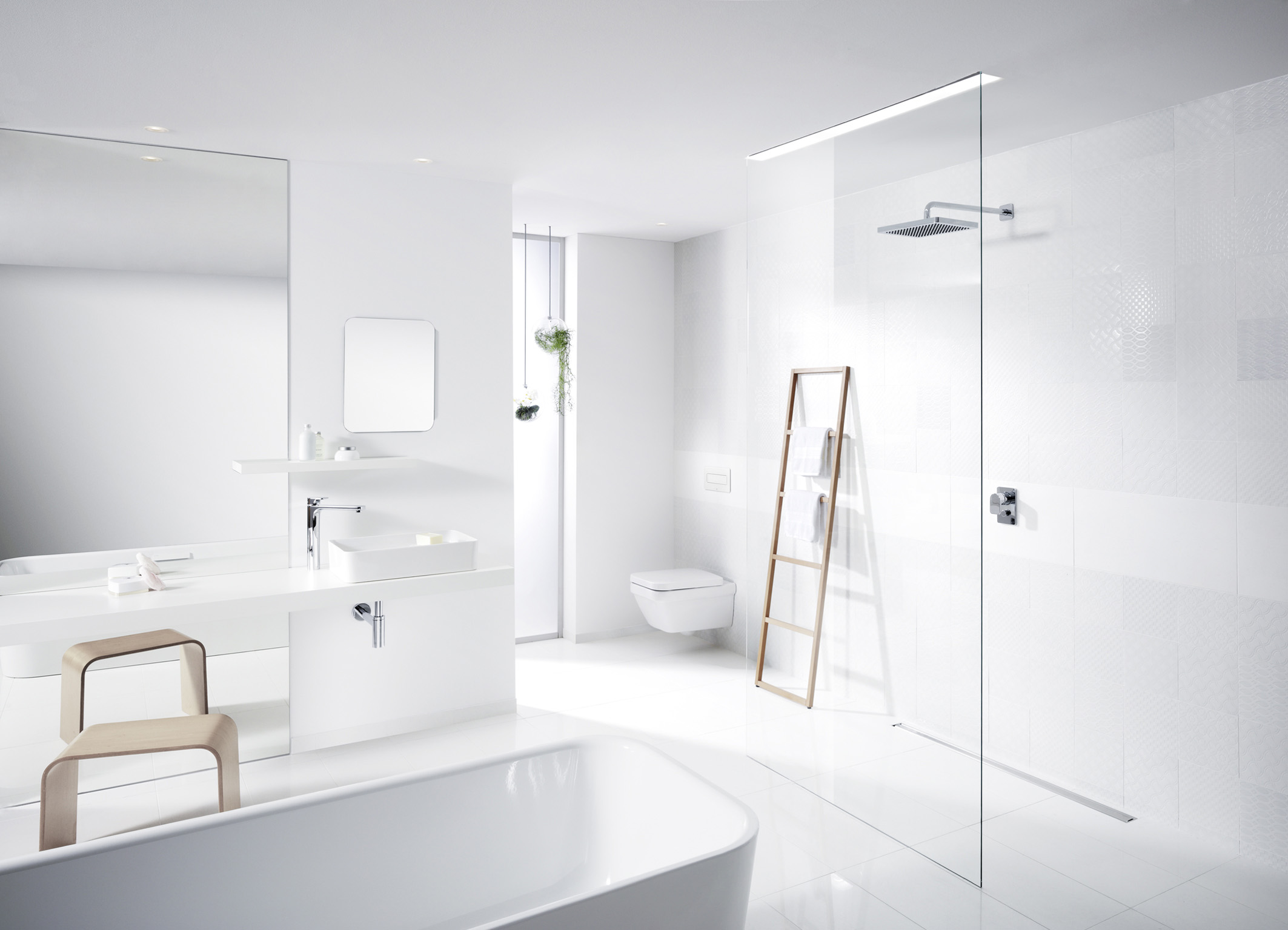 Helder en royaal - die eigenschappen karakteriseren het hedendaagse badkamerontwerp. Heel bewust kiezen binnenhuisarchitecten hier de kleur wit. Het onderstreept de loft-achtige ruimtebeleving. Met slechts enkele elementen in de vorm van houten accessoires en planten wordt die ruimtelijkheid geaccentueerd. Dit laat zich goed combineren met sanitair producten in uitbundig glanzend chroom- of ingetogen matuitvoering.