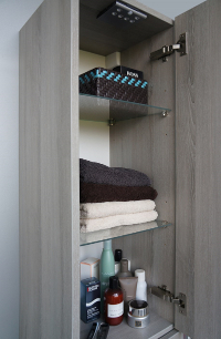 Geniet van maximale opbergruimte door een hoge badkamer kast. Een hoge kast heeft een vaste legplank in het midden van de kast en 4 verstelbare legplanken van glas. In een hoge kast is er veel ruimte om bijvoorbeeld handdoeken en cosmetica netjes achter een deur op te bergen. Hoge badkamerkasten kunnen uitgevoerd worden met 1 grote deur, 2 losse deuren of een spiegeldeur (handig, direct een passpiegel in de badkamer!).