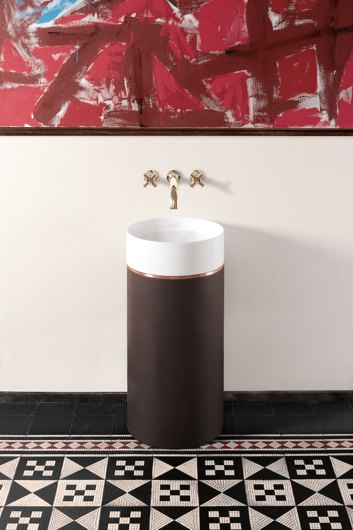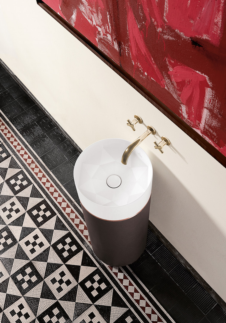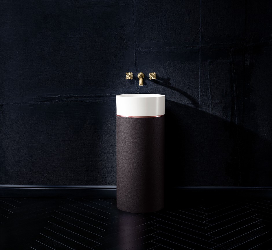 De zuil van Octagon is beschikbaar in een aantal hoogwaardige bekledingen. Zo is er keuze uit: Dark Chestnut, Mocha Leather of het extravagante Smoky Slate. Bovendien zorgt de koperen ring tussen de wastafel en de zuil ervoor dat de bekleding mooi blijft zitten. Ook voegt de ring een extra designelement aan het geheel toe.