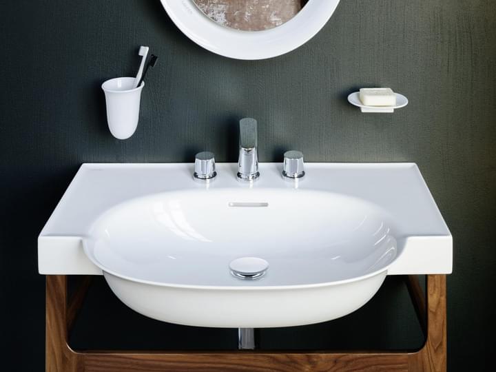 Er zijn verschillende configuraties voor de wastafel ontworpen om zich aan de klassieke of meer hedendaagse smaken aan te kunnen passen. De opzetwastafel met geïntegreerde legplank is verkrijgbaar in verschillende breedtes, vanaf 600, 800 en 1200 mm en heeft een kleine fontein van 500 mm breed en een waskom van 550 mm breed.