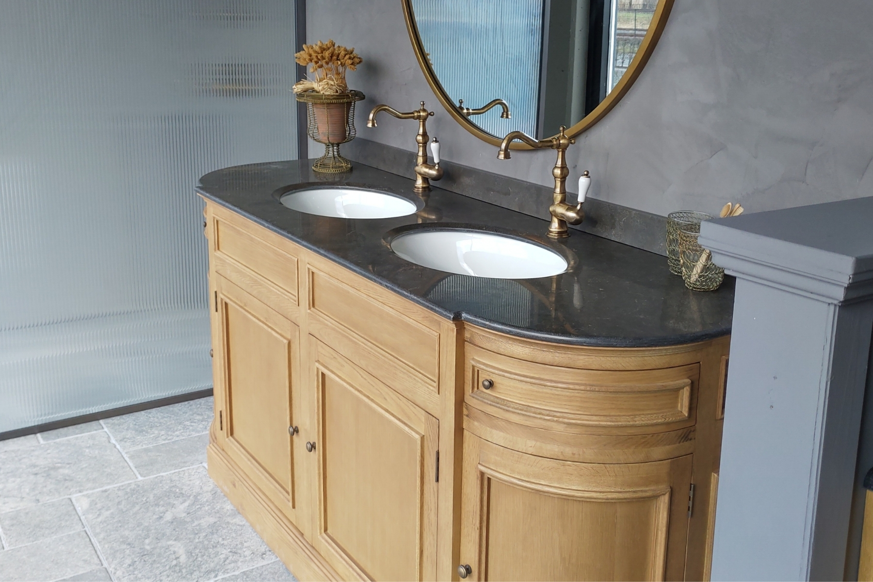 Een massief houten wastafelmeubel met een stijlvol natuurstenen blad en een klassieke kraan geeft de typisch klassieke of landelijke uitstraling aan je badkamer.