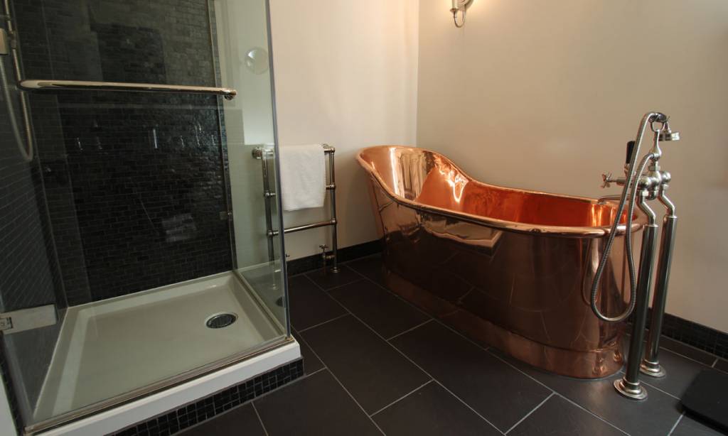 Klassiek landelijke, vrijstaand bad van koper op sokkel.