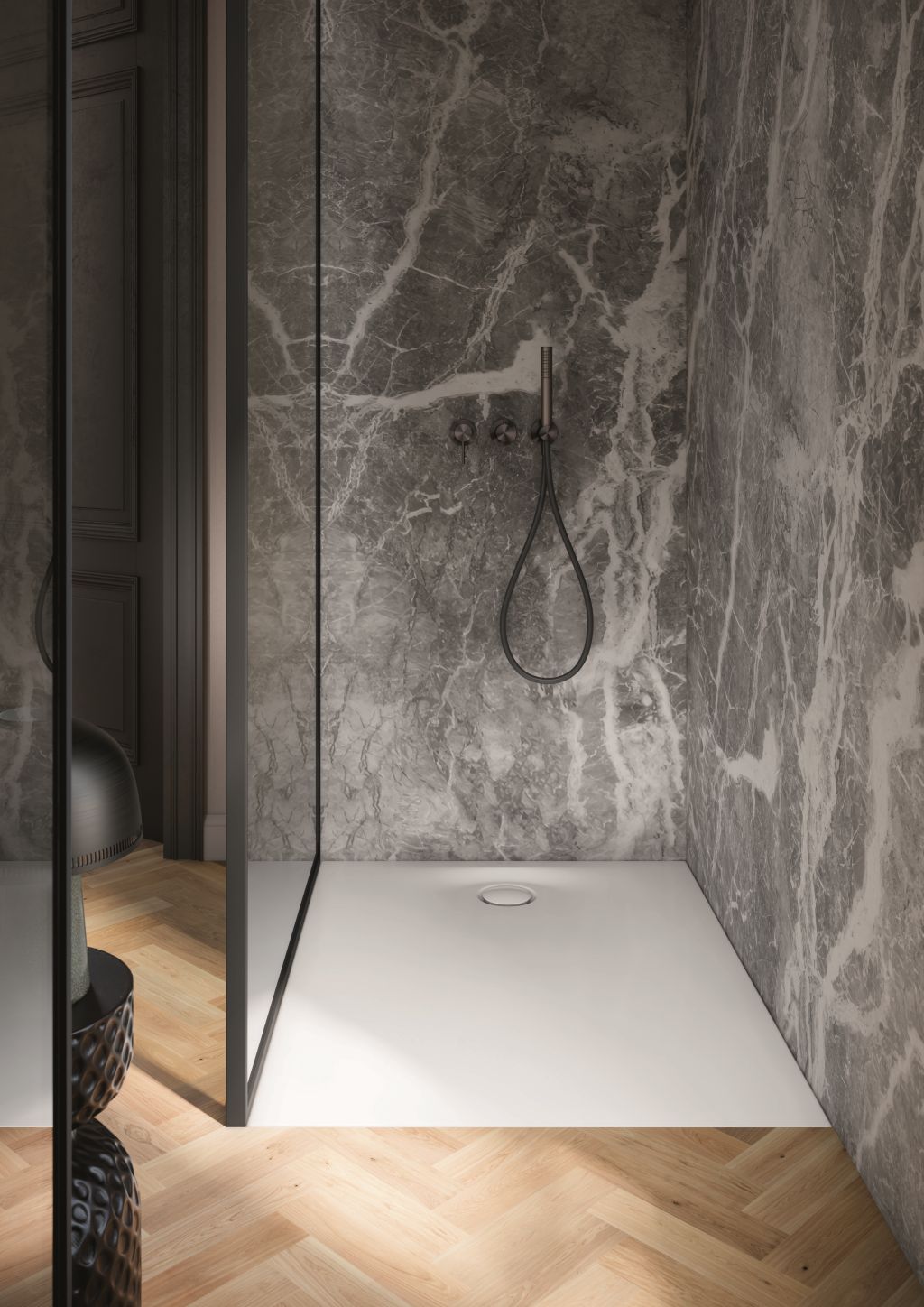 Een bijzonder voordeel ligt in de doordachte geometrie van het doucheoppervlak. Deze leidt het water ook bij de extreem vlakke constructie veilig en schoon naar de afvoer. Zo ontstaat een puristische doucheruimte die niet alleen licht en ruimtelijk aandoet, maar in het dagelijks leven ook betrouwbaar functioneert. De geringe inbouwhoogte is daarmee geen compromis, maar een echte winst aan comfort. De afvoer dicht bij de wand aan de smalle zijde zorgt bovendien voor een aangenaam, doorlopend sta-oppervlak en ondersteunt de heldere architectonische uitstraling.
