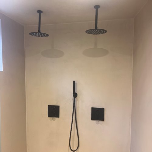 Bij het ontwerpen van de badkamer lieten Sterre en Sander zich inspireren door de mooie badkamer van hun vakantieverblijf. ‘’We wilden dezelfde sfeer bij ons thuis terug laten komen,’’ vertelt Sterre. Ze kozen daarom voor betonstuc in een warme zandkleur en combineerden dit met zwart sanitair voor een stoer tintje. Deze keuze zorgde voor een moderne, strakke uitstraling die tegelijkertijd onderhoudsvriendelijk is. Betonstuc is namelijk waterproof en heel gemakkelijk schoon te houden.