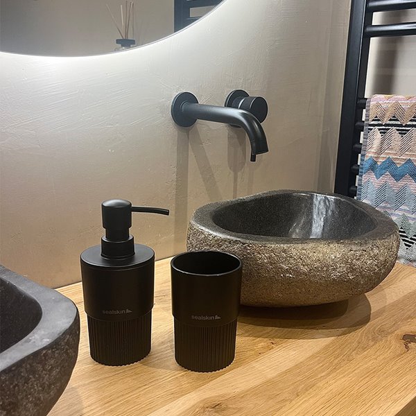 Om de badkamer helemaal af te maken, kozen Sterre en Sander voor stijlvolle accessoires van Sealskin. De zwarte badmat, toiletborstelhouder en zeepdispenser van de Brave serie sluiten perfect aan bij de zwarte accenten van deze badkamer. Ze zorgen voor een stoer contrast bij het beige betonstuc. En eerlijk is eerlijk: wie wil de kleur van de badkamerkranen en douche nu niet laten matchen met je accessoires?!