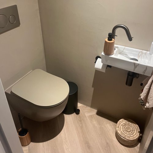 Naast de badkamer heeft het stel ook het toilet gerenoveerd. Sterre en Sander kozen ervoor om de stijl door te trekken naar deze kleine ruimte. Het toilet is nu voorzien van dezelfde beige betonstuc wanden, waardoor het perfect aansluit bij de rest van de badkamer. Ze kozen voor een wit fonteintje met marmerlook en een stijlvolle zwarte kraan. In combinatie met de eikenhouten Earth accessoires geeft dit een warme sfeer aan het toilet. Ditzelfde hout accent vind je boven in de badkamer weer terug in het meubel.