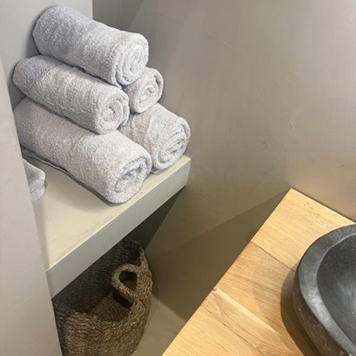 Naast het toilet en de dubbele wastafel kozen ze voor een slim nisje naast het wastafelmeubel om handdoeken op te bergen. Zoals je ziet zorgt het oprollen van de handdoeken direct voor een luxe uitstraling in de badkamer.