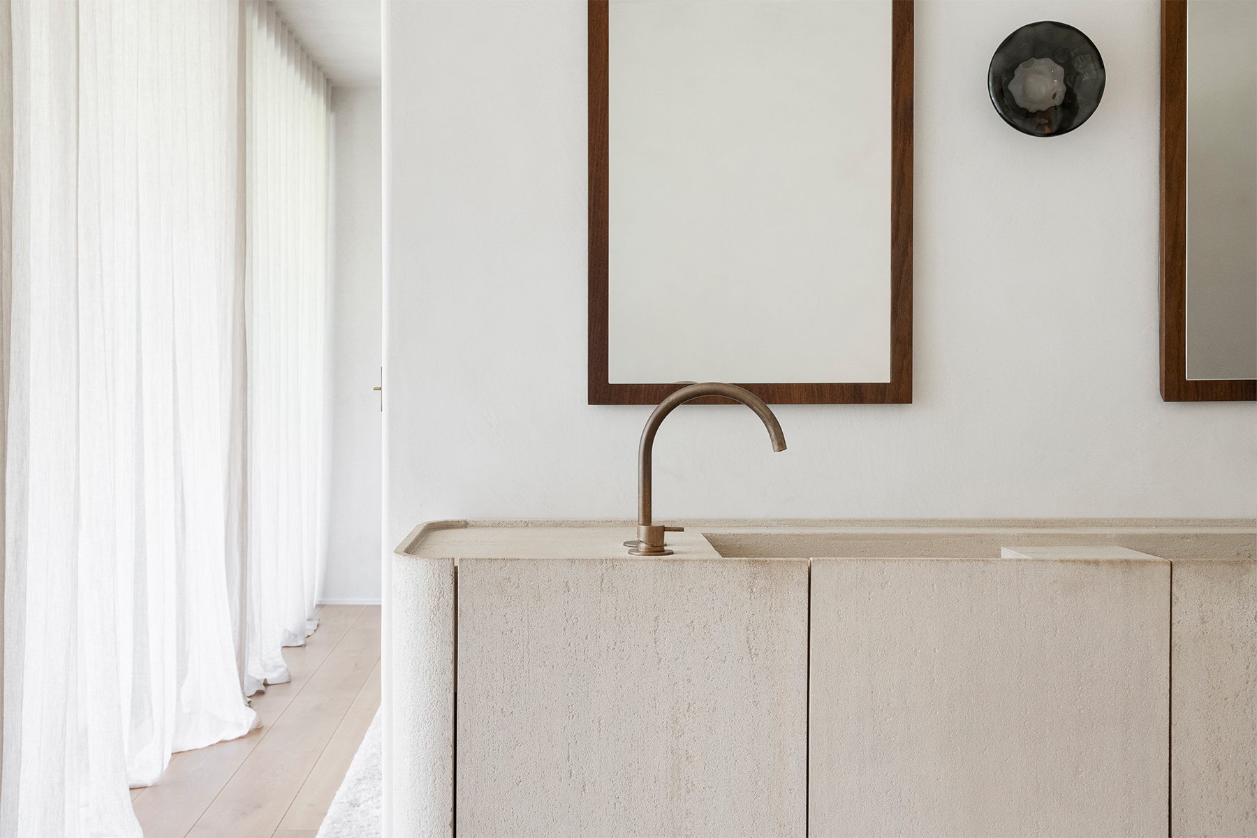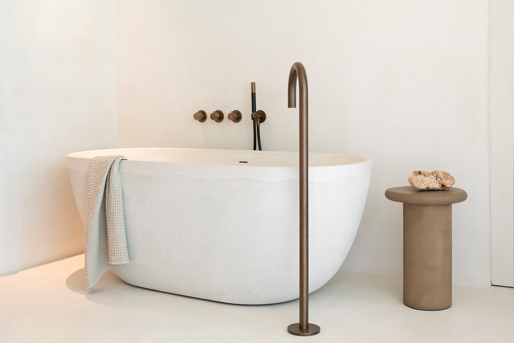 Actrice Kim van Oncen en haar man waren voor hun nieuwe villa op zoek naar een badkamer waar al hun wensen samenkomen. 'Een goede vriendin en interieurarchitecte had een soortgelijke badkamer met mooie organische en ronde vormen. Dat vonden wij prachtig. En de badkamer moest vooral rust en ontspanning uitstralen.' Met deze stijl en ontwerp in hun achterhoofd ging de zoektocht van start.