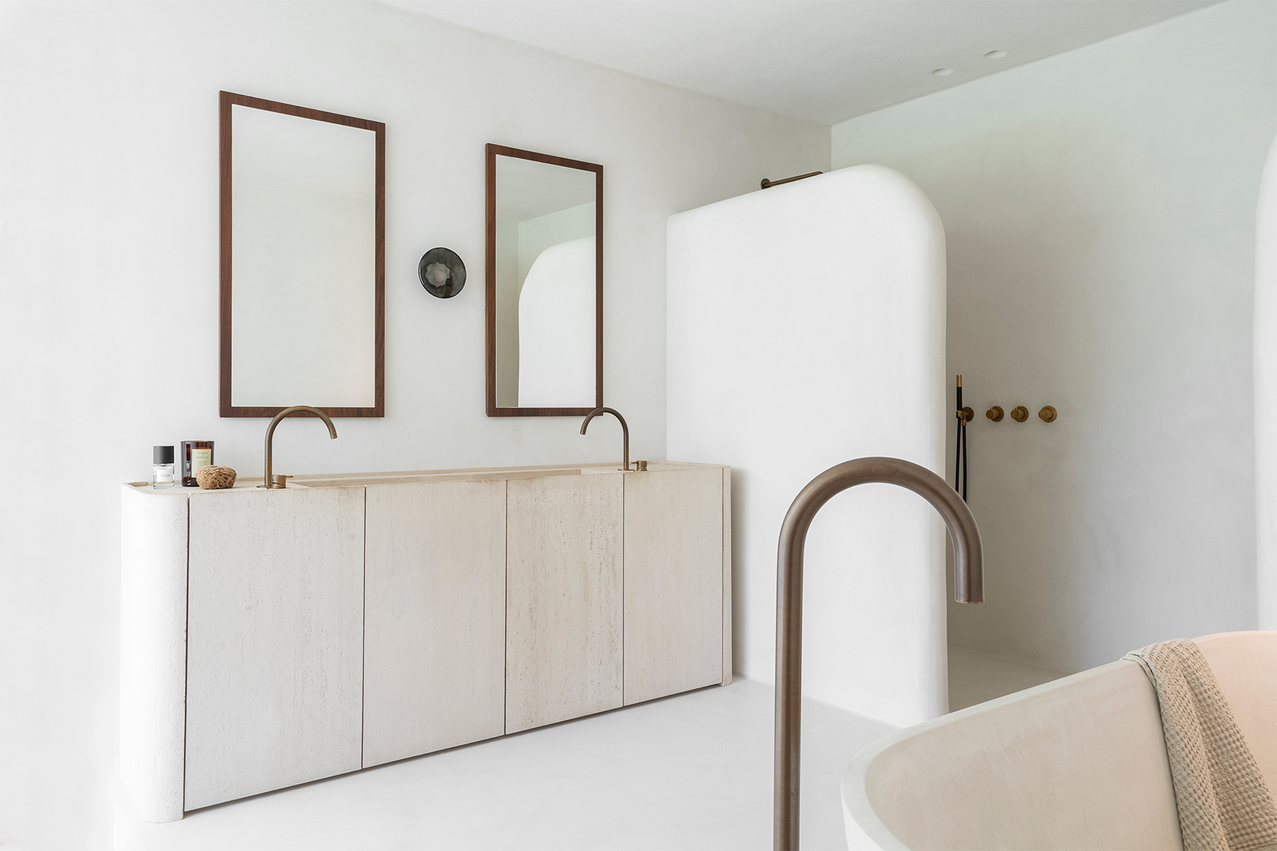 Deze badkamer straalt dan ook echt rust en ontspanning uit door zijn minimalistische design. Het interieur wordt gedomineerd door zachte, witte tinten en natuurlijke materialen, wat een serene vakantie sfeer creëert. De badkamer beschikt over een dubbele wastafel met een strakke, lichte kast die harmonieus opgaat in de omgeving. De stijlvolle kranen in verouderd messing voegen een vleugje luxe toe en complementeren de badkamer perfect.