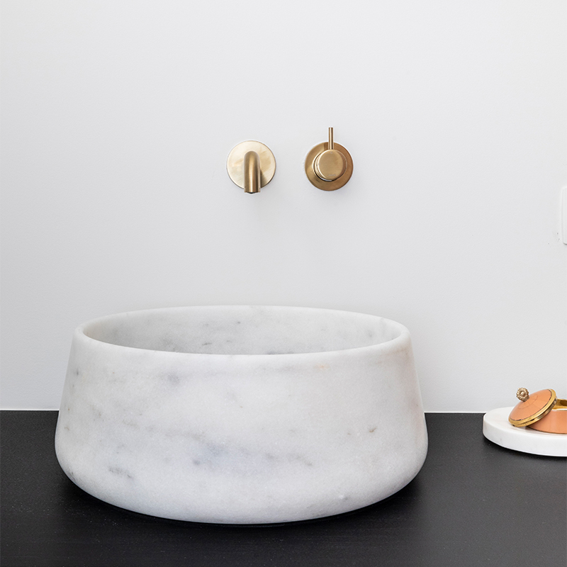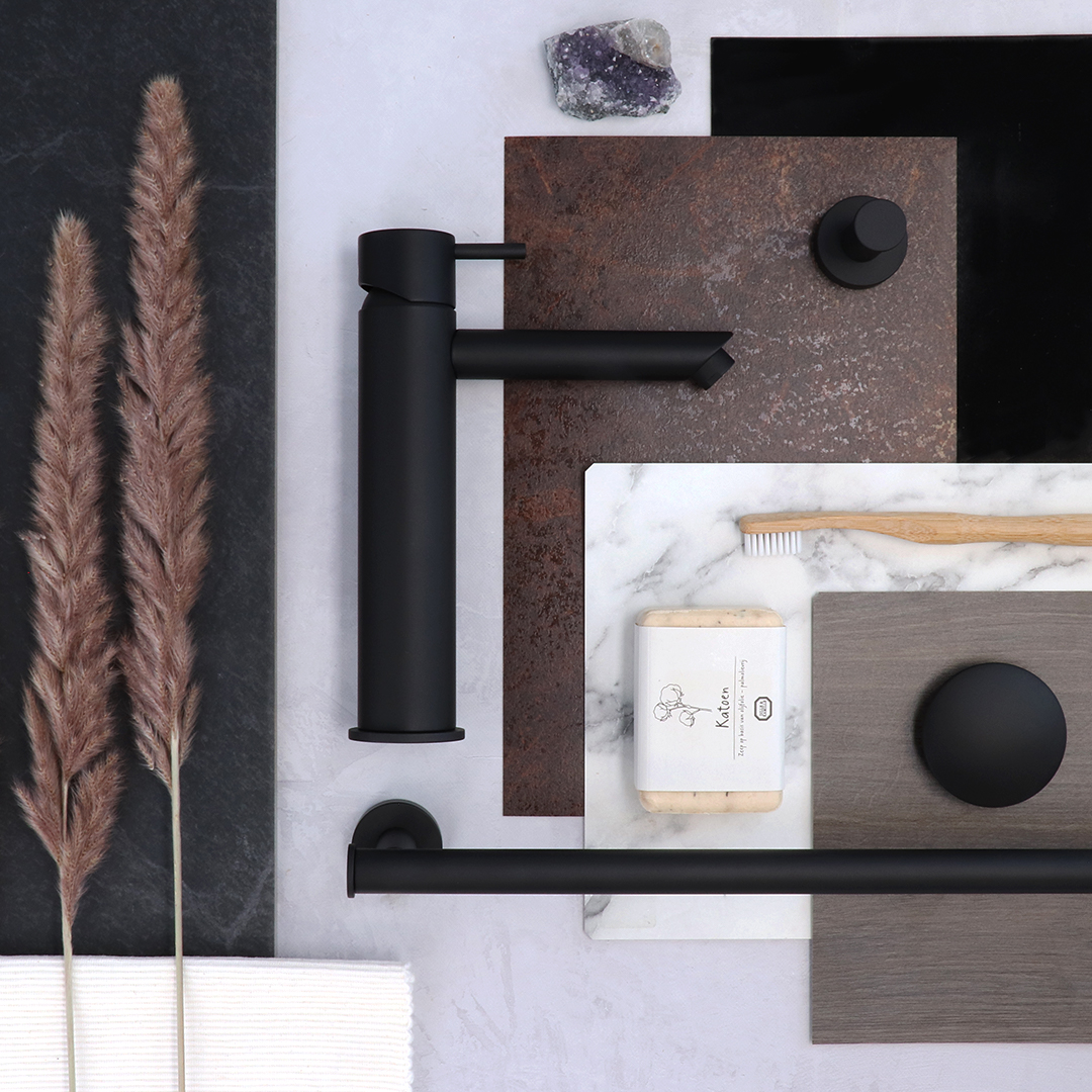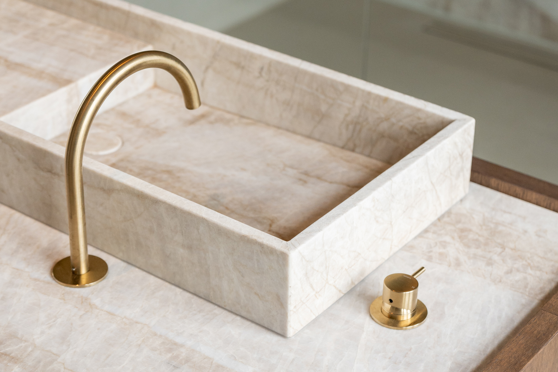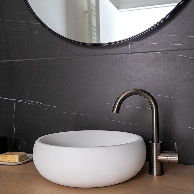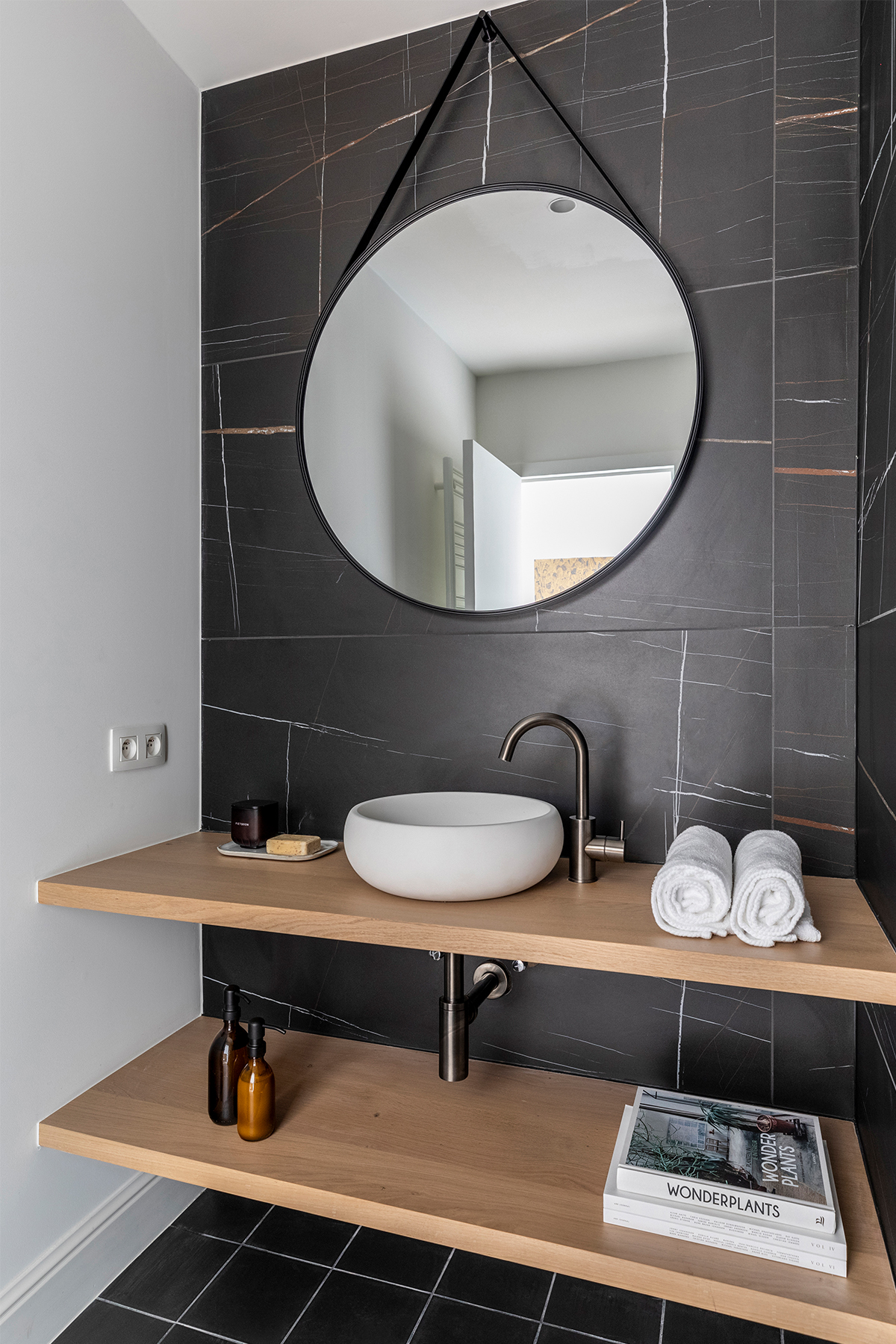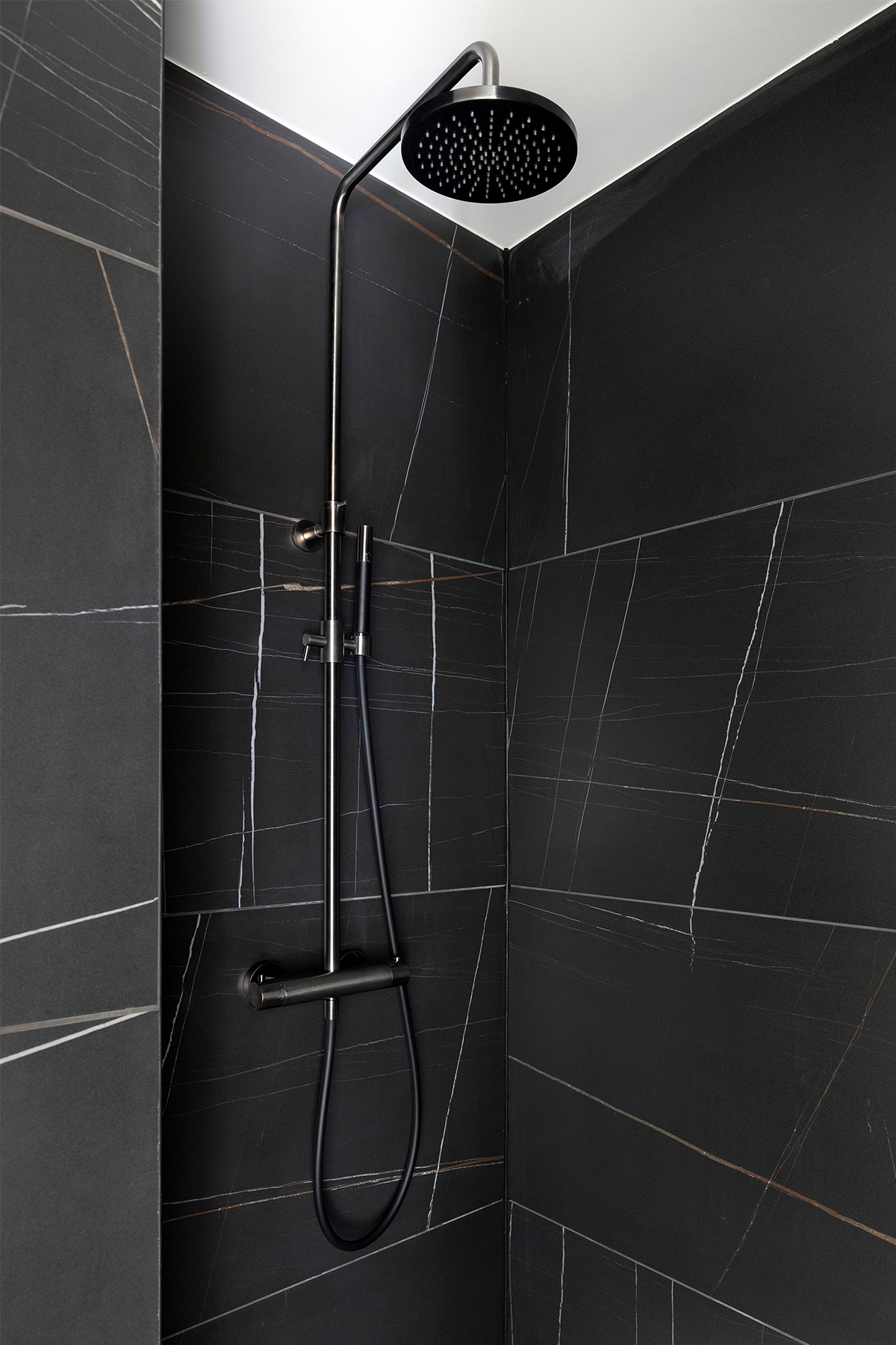 Bij de kamer met de marmeren schouw ontwierp Thomas een badkamer met zwarte keramische tegels met marmerlook. ‘Zwarte kranen zouden hier misschien een voor de hand liggende keuze zijn, maar ik vind de Cobber kranen met een finish van verouderd ijzer veel mooier. Het is minder hard van kleur, stijlvoller en veel gebruiksvriendelijker, zeker bij intensief gebruik zoals in een vakantiewoning.